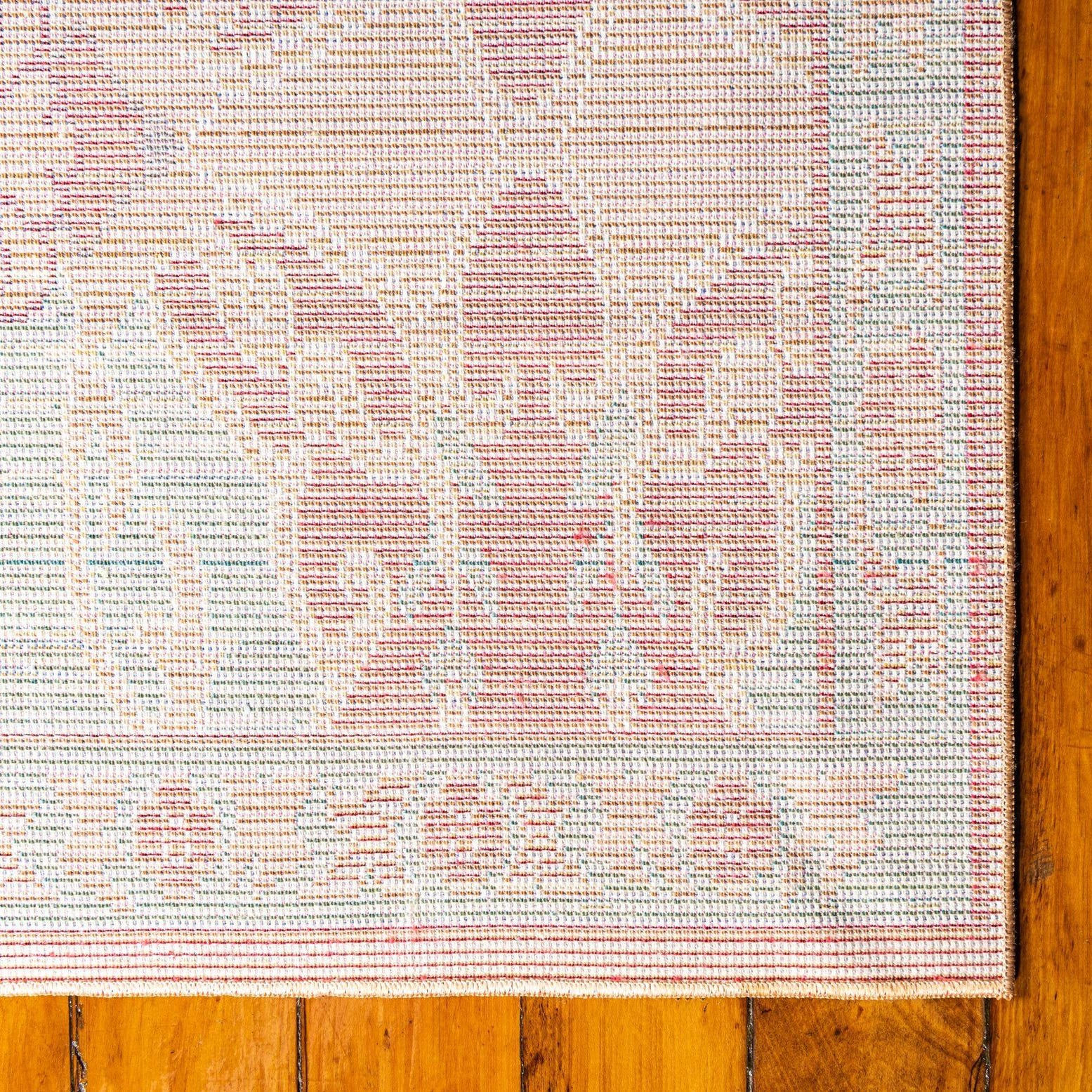 The Alexis Collection offers a 10 Ft Runner rug machine woven from 100% polyester, designed for durability and comfort. Its intricate pattern boasts a harmonious blend of colors, including peach as the background, complemented by shades of beige, blue, burgundy, gray, light blue, light brown, orange, puce, and yellow. The detail of the design features traditional motifs, creating a tapestry of visual interest that draws from classic style inspirations.