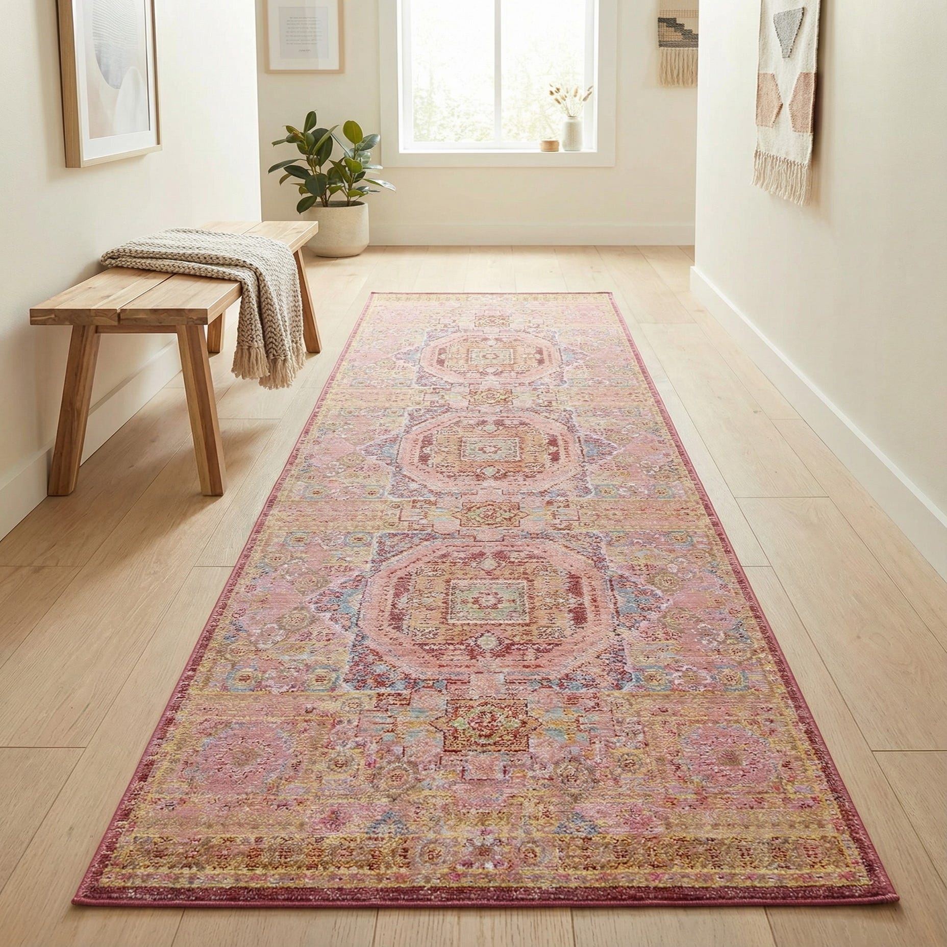 Ideal for a hallway or entry, this runner brings a warm, pastel palette that pairs well with light wood floors, painted trims and brass or antique-gold accents. Use it to layer in front of a sofa, anchor a narrow kitchen aisle, or add softness alongside a bed; it works with mid-century modern pieces for a softened contemporary look, or with linen, rattan and woven textures for a relaxed bohemian or cottage-style interior.