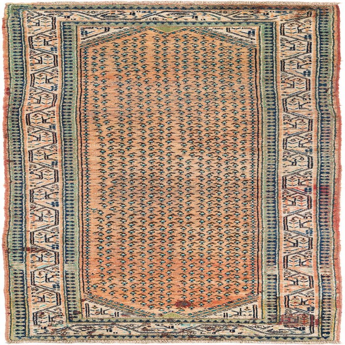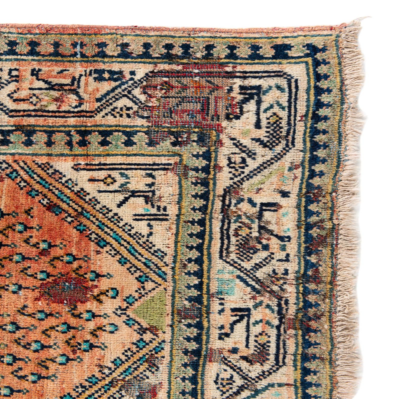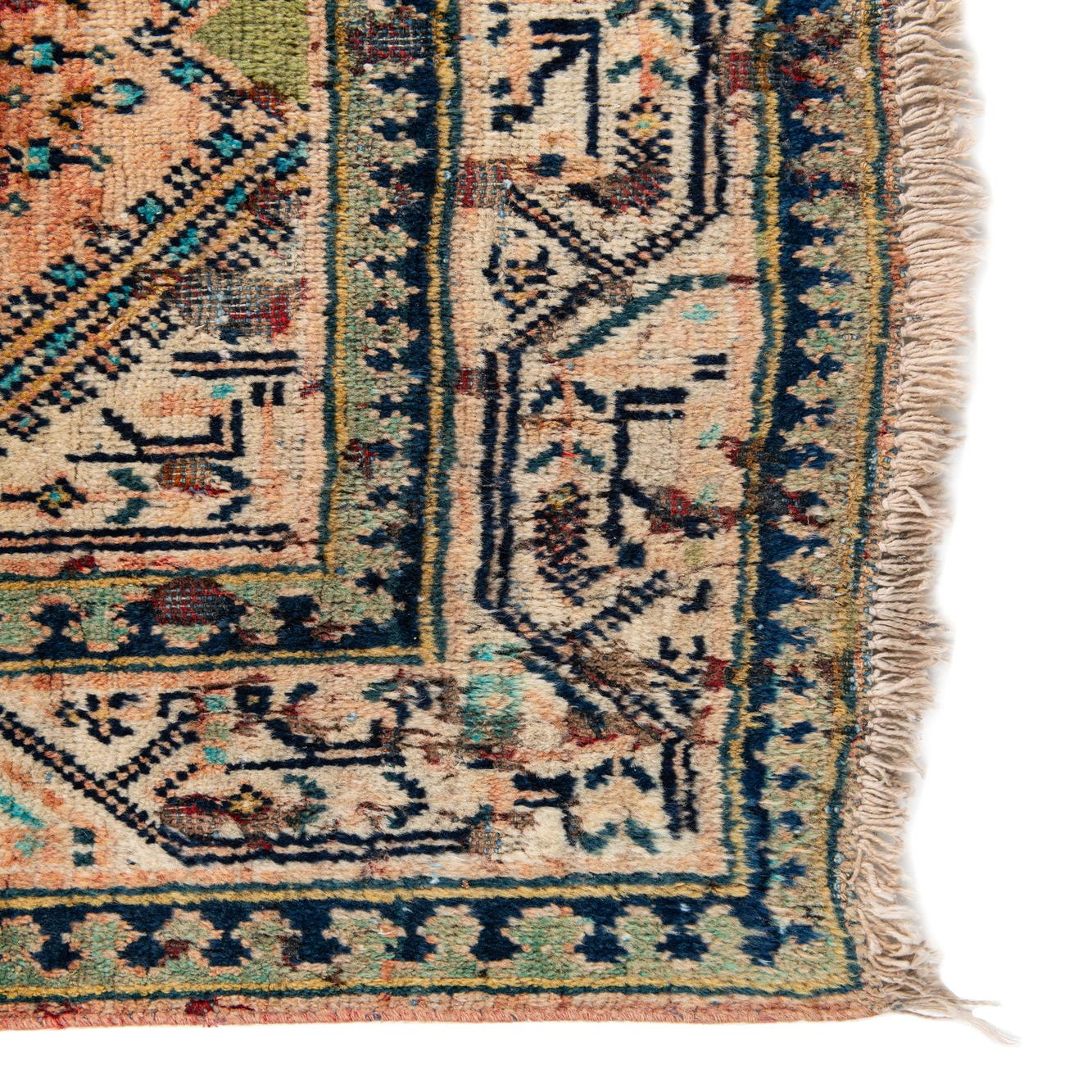 Primary color is Peach. Colors in this rug include: Peach, Green, Ivory, Light Blue, Navy Blue, Olive.