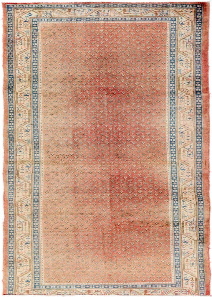 Primary color is Peach. Colors in this rug include: Peach, Beige, Blue, Ivory, Navy Blue.