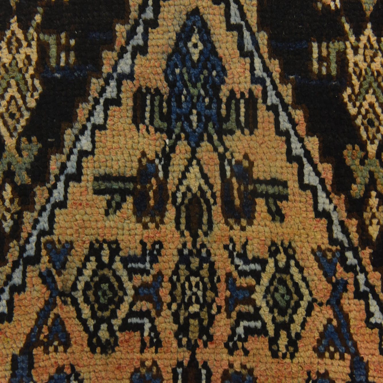 Primary color is Peach. Colors in this rug include: Peach, Blue, Green, Light Blue, Navy Blue, Ivory.