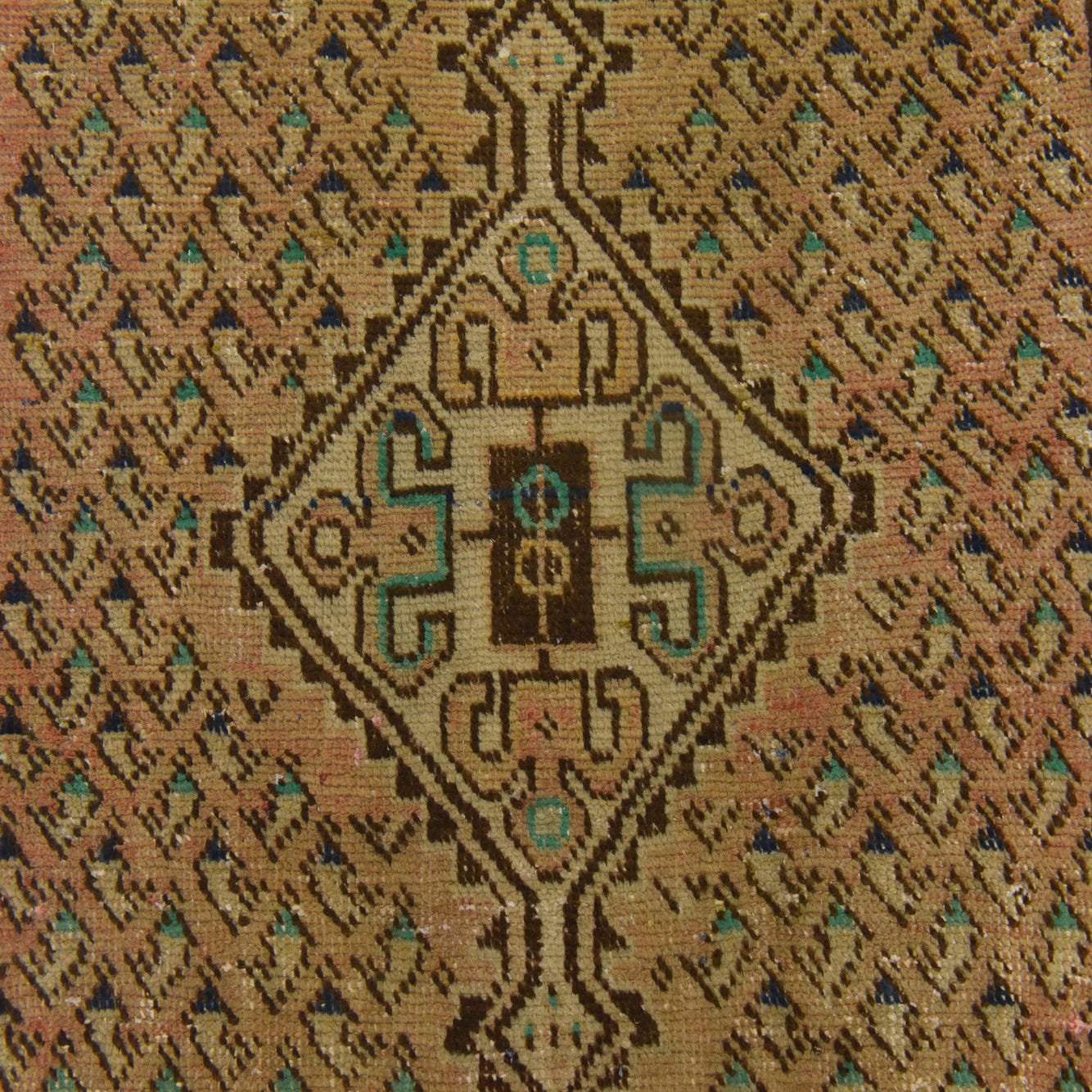 Primary color is Peach. Colors in this rug include: Peach, Beige, Brown, Cream, Turquoise, Tan.