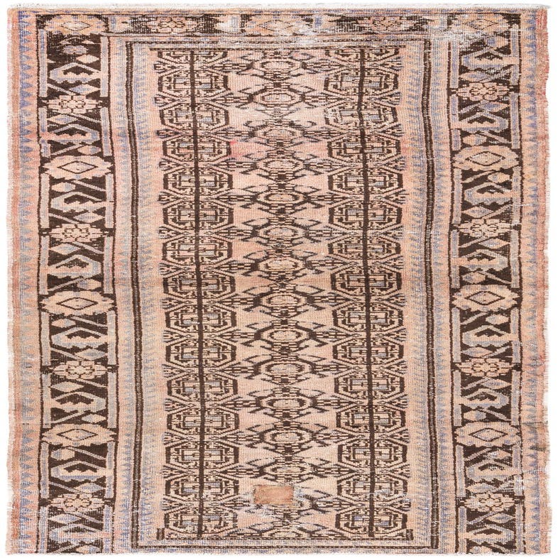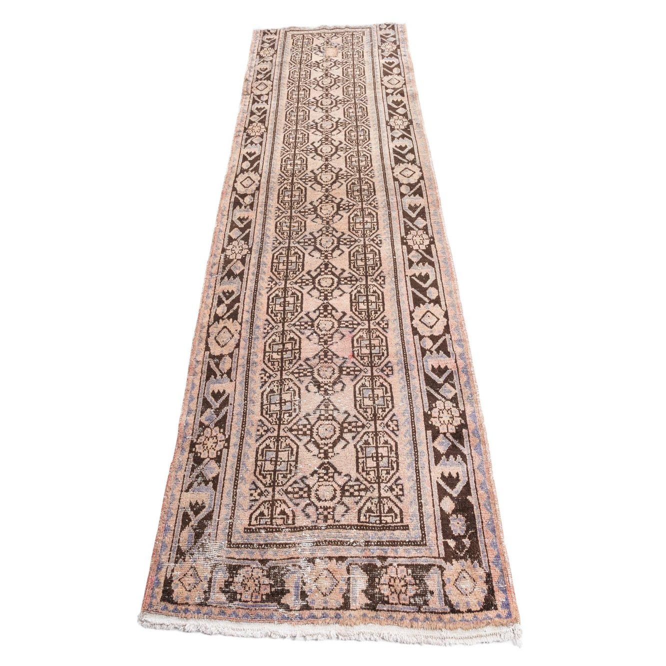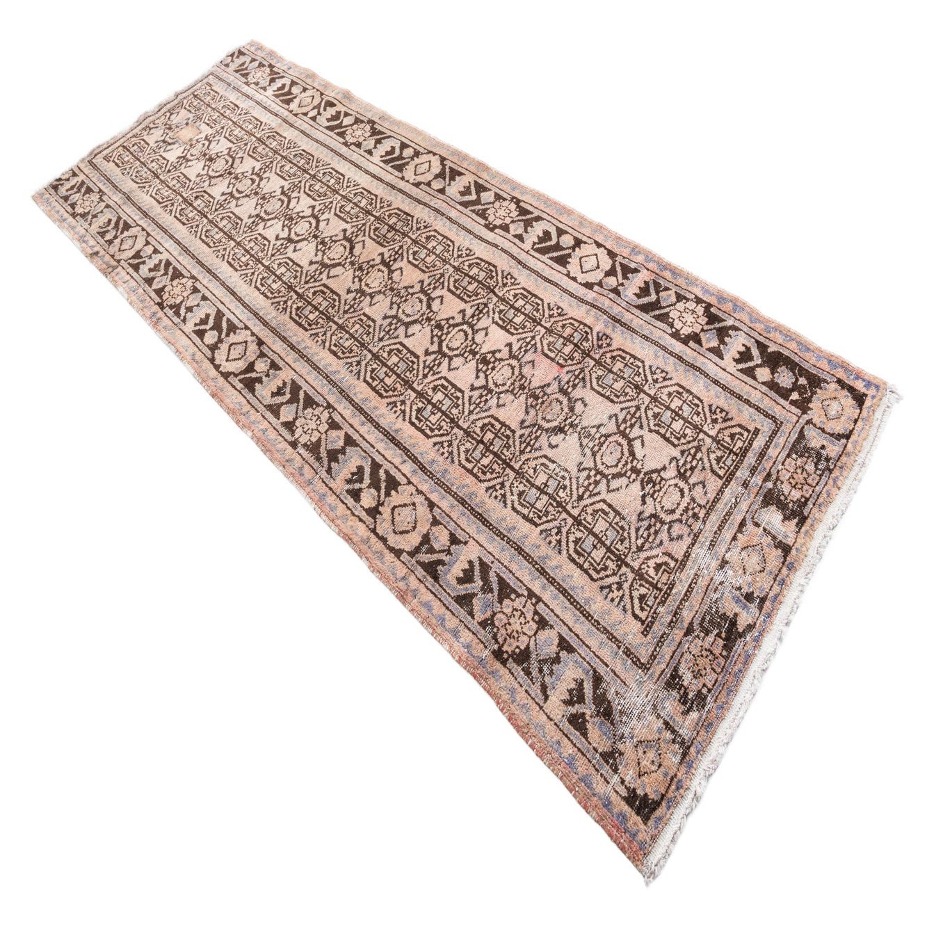A 10 ft runner rug with a faded orange and brown Persian pattern, ideal for a hallway.
