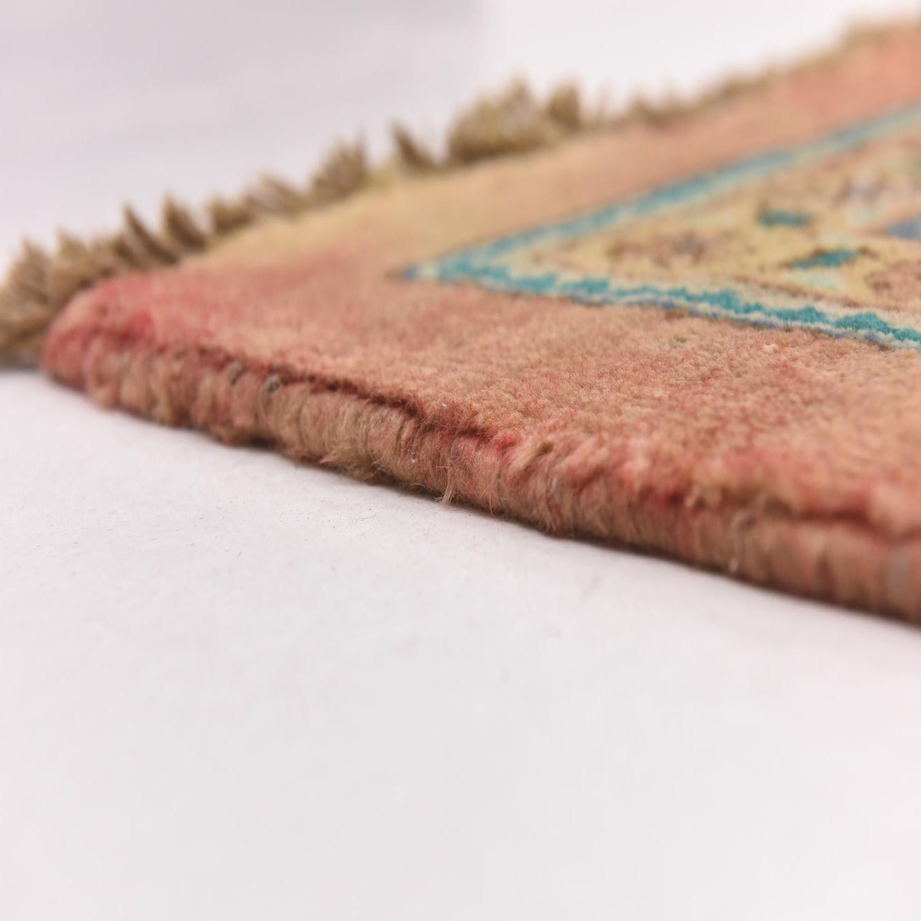 Primary color is Peach. Colors in this rug include: Peach, Blue, Ivory, Light Blue, Navy Blue, Turquoise, Beige, Brown.