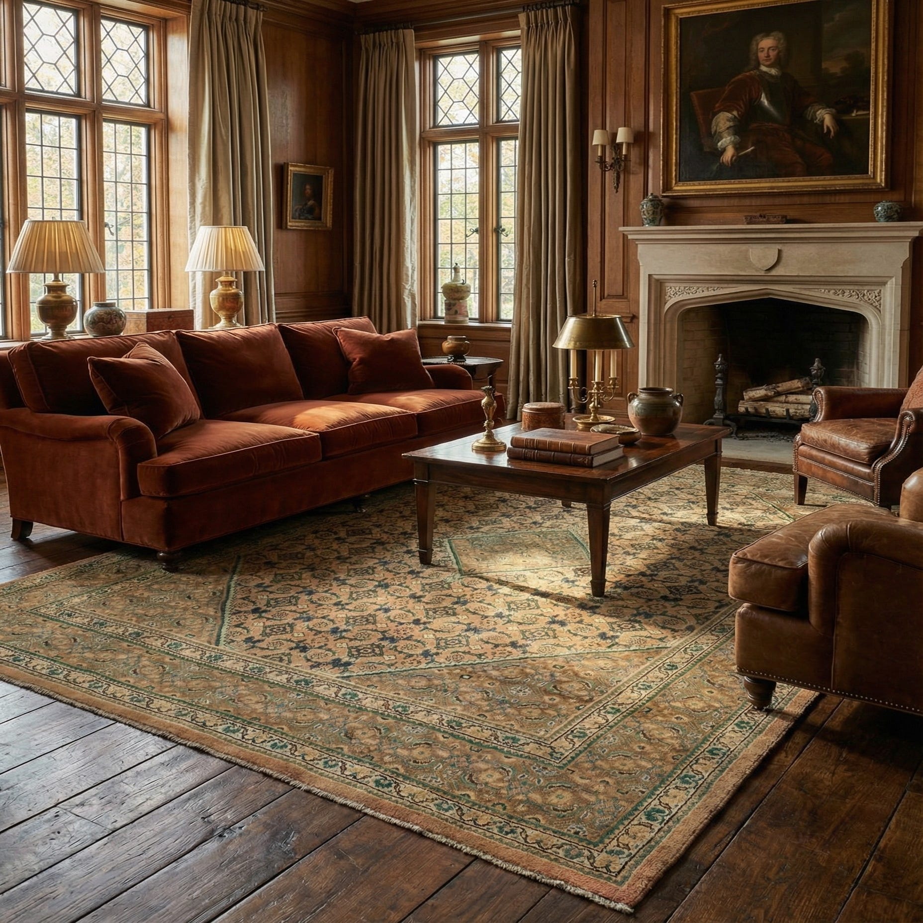 Hand knotted from 100% wool, the rug has a dense, tactile surface that feels warm and substantial underfoot. It works well as the centerpiece of a formal living room or dining area where its scale and pattern can ground seating and table groupings, and it also complements a study or library with dark wood and leather. Pair it with navy upholstery to echo the darker accents, ivory walls or textiles to brighten the peach ground, and brass or warm wood finishes for a cohesive, inviting interior.