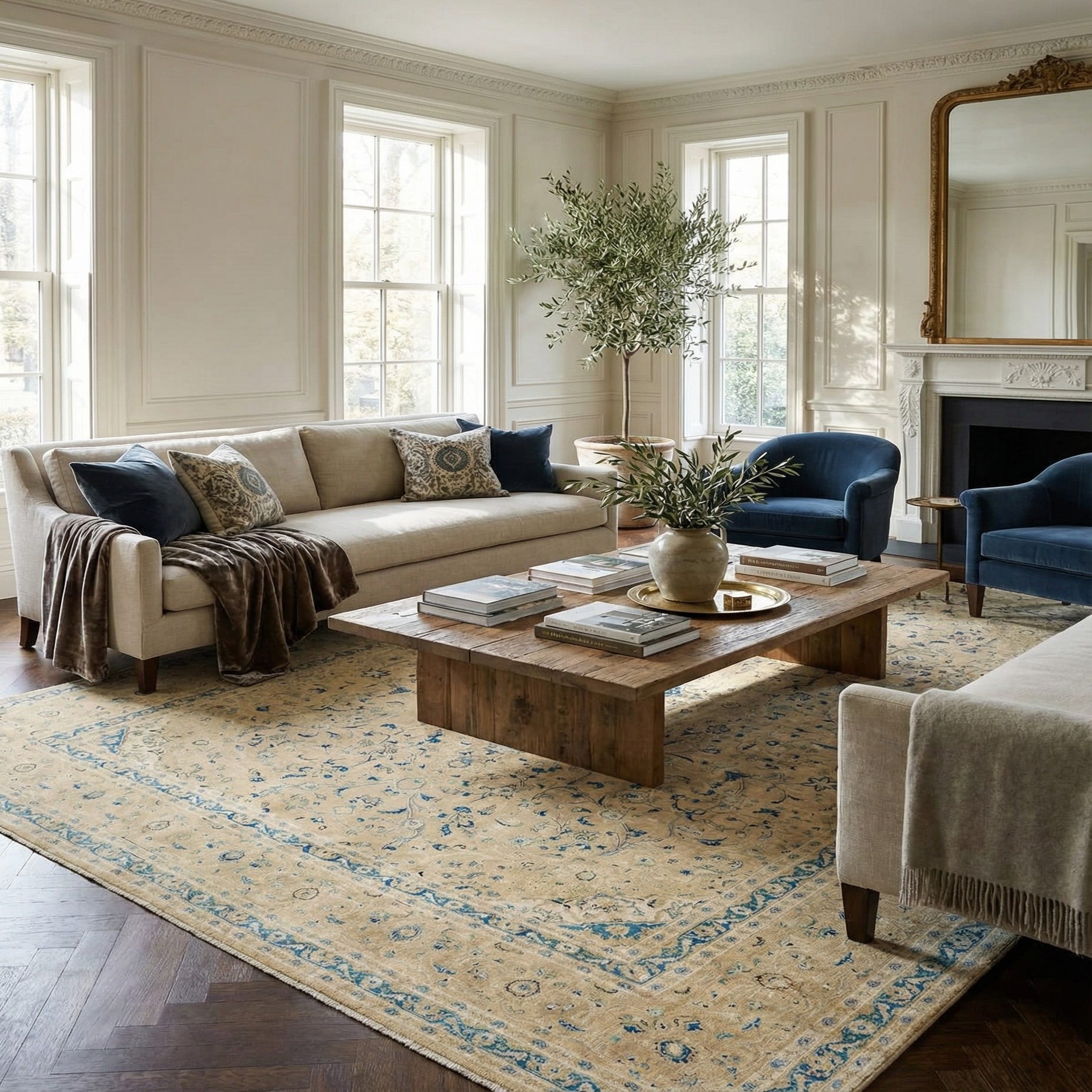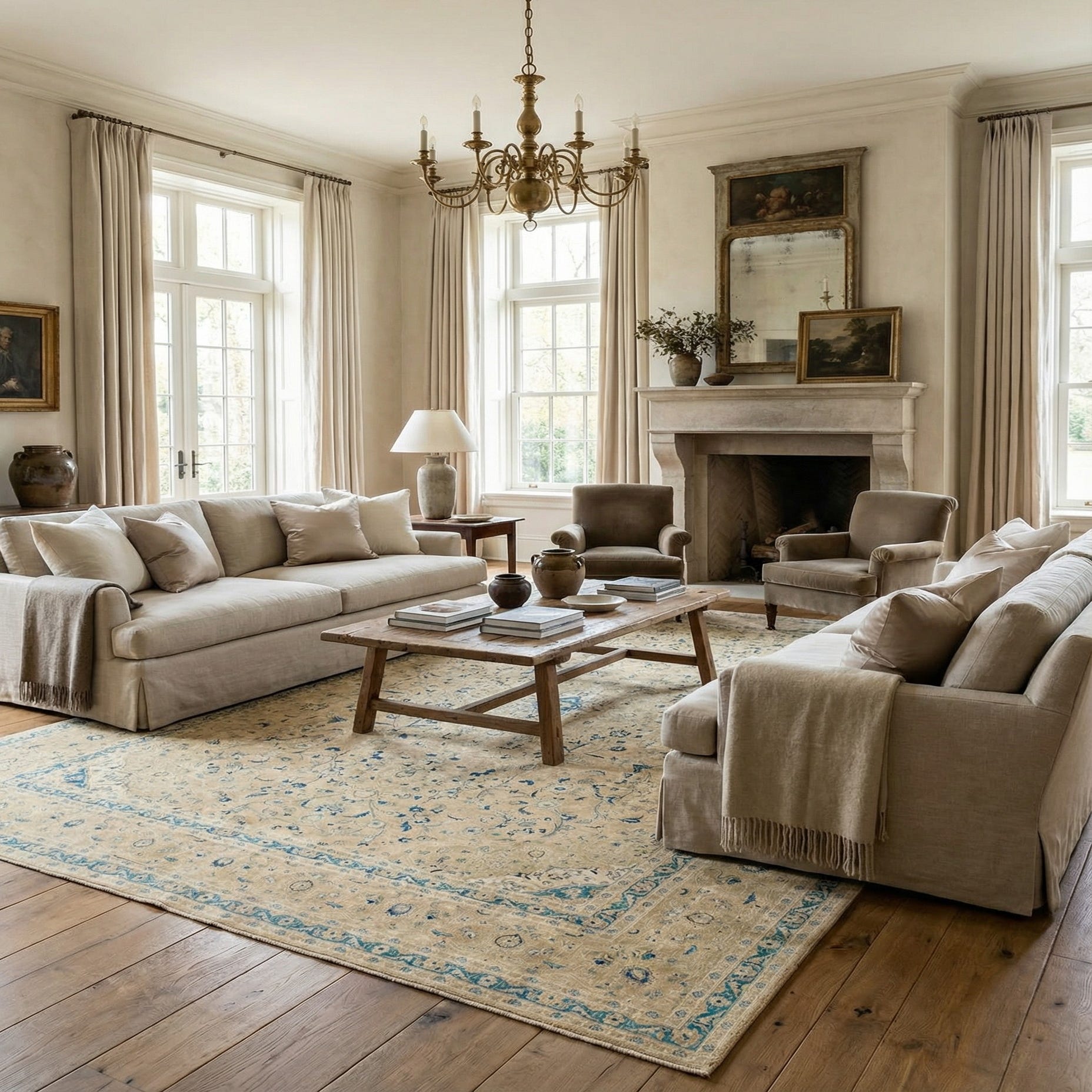 This rug can adapt to various decor settings, particularly excelling in spaces that aim to evoke a sense of sophistication and historical charm. It would pair well with rich wooden furnishings in a classic or traditional room, serve as a contrasting anchor in a more contemporary setting, or complement a coastal-inspired palette with its serene blues and warmed neutral base.