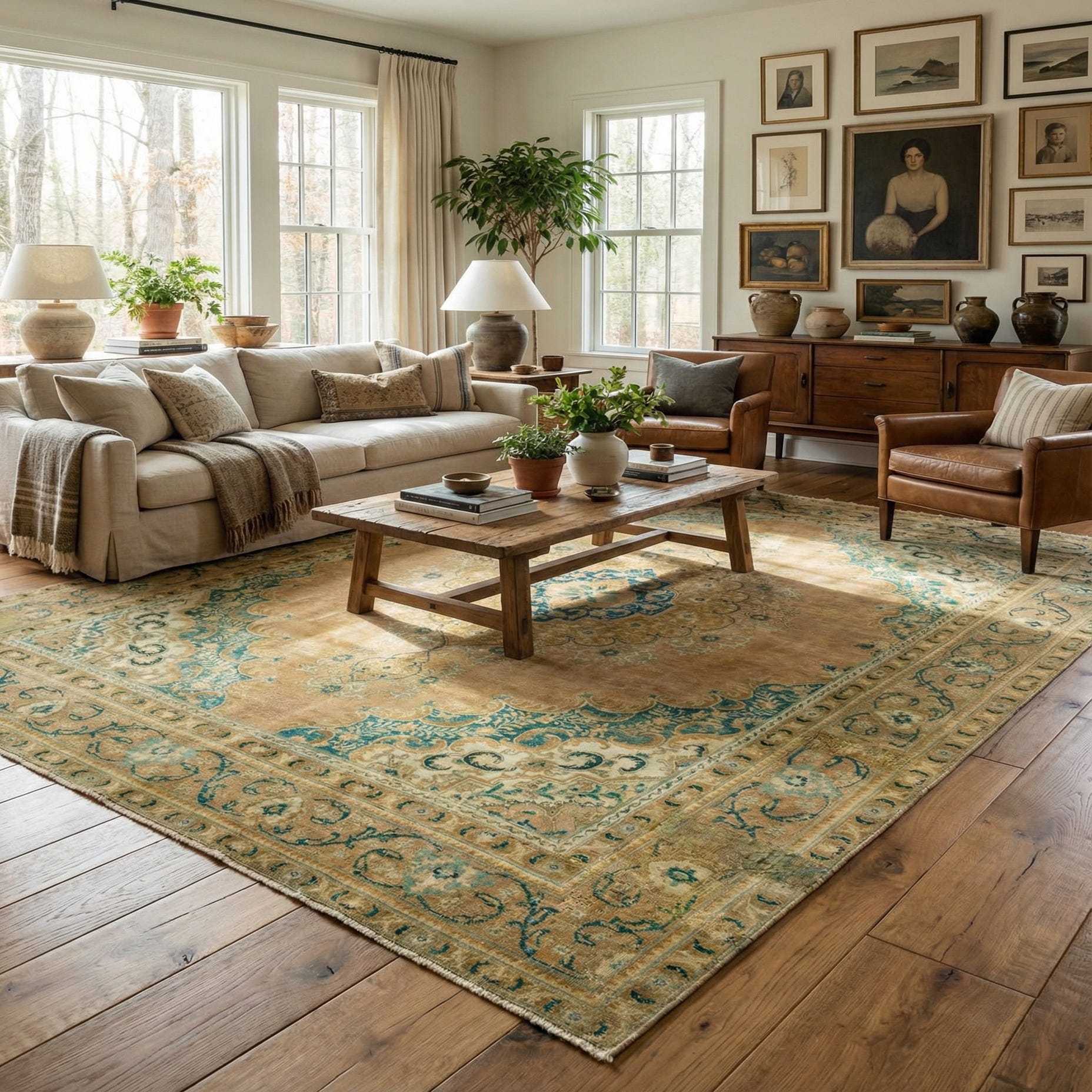 This Ultra Vintage rug can effortlessly integrate into interiors that feature antique furnishings, wood accents, or a mix of eclectic decor. Equally, it can provide an elegant contrast within modern minimalist settings that seek a touch of historical allure.