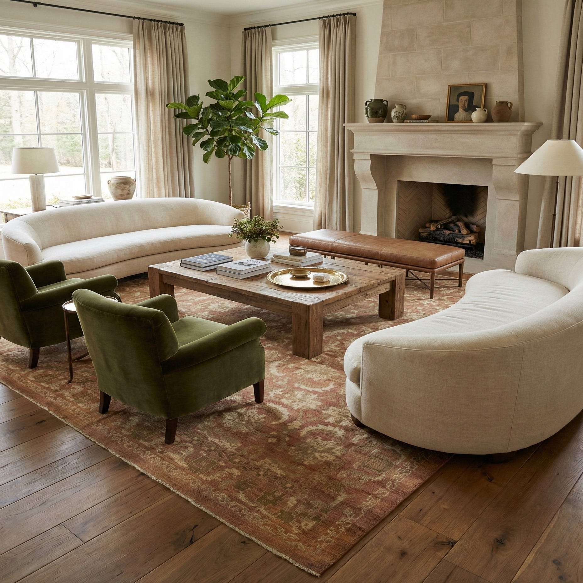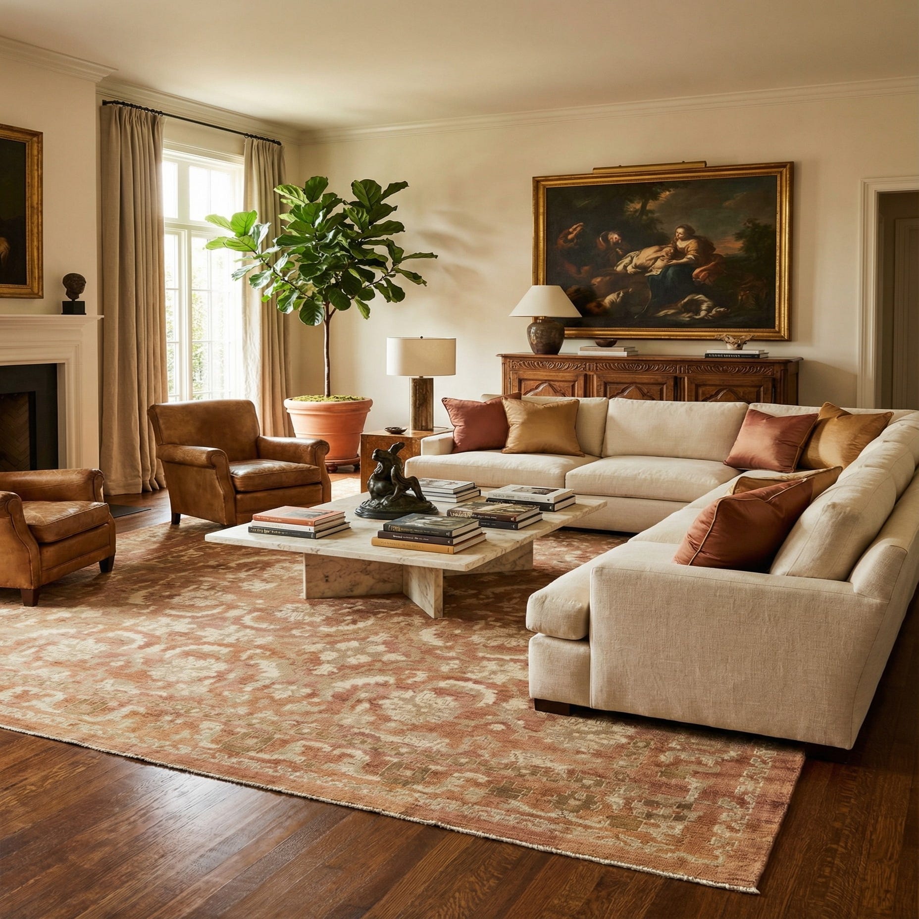 This rug would be at home in interior designs that emphasize natural materials and subtle color schemes. Light wood furnishings, antique pieces, and elegant upholstery would complement its timeless nature. It is suitable for both intimate settings, where its gentle hues can create a soothing ambiance, and more vibrant spaces where it can serve as a grounding element.