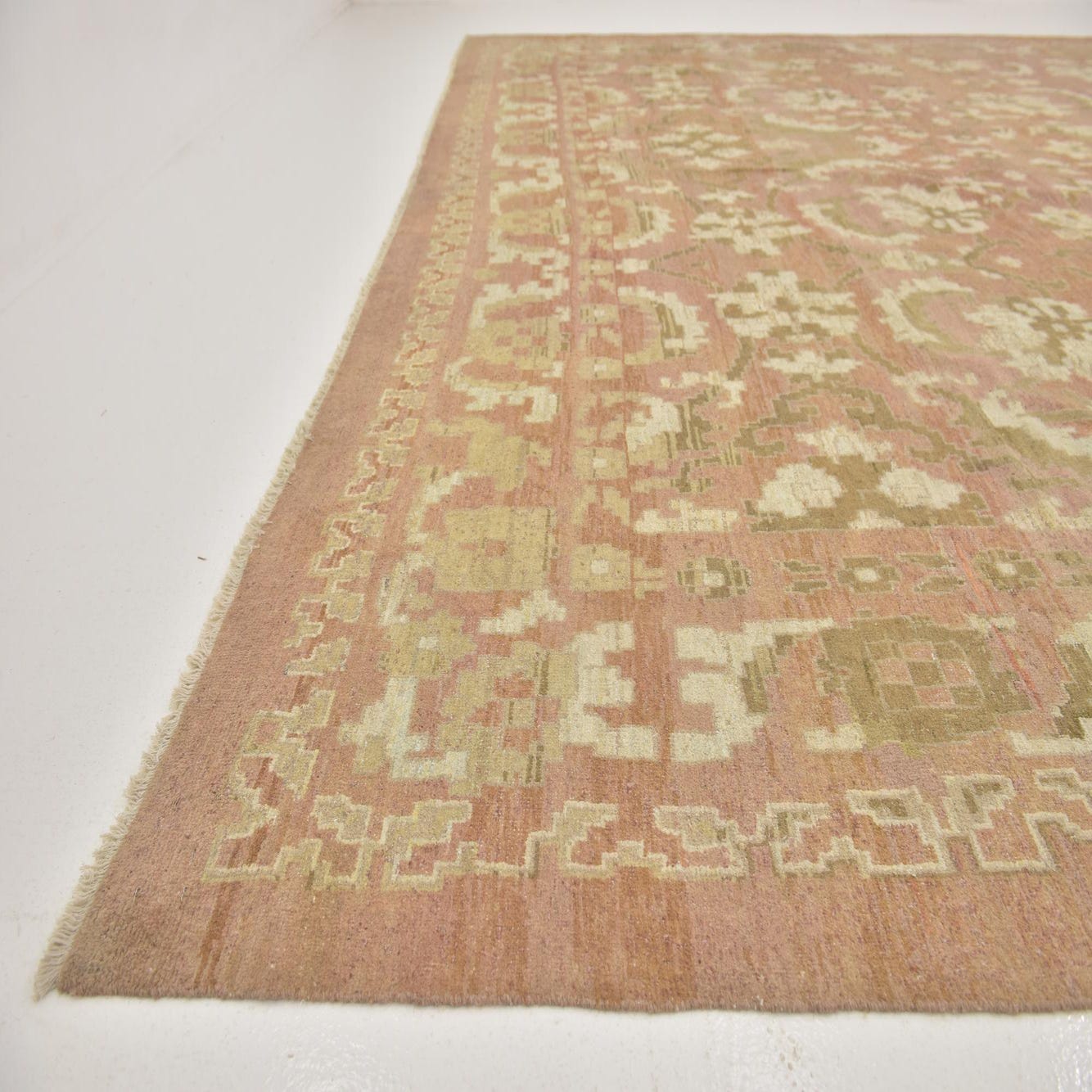 This Oushak collection rug is a hand-knotted piece made from 100% wool, offering a plush, tactile experience underfoot. The large scale of 13x18 makes it suitable for spacious rooms where it can lay a foundation of warmth and elegance. The rug's peach background is harmoniously complemented by flourishes of beige, green, ivory, and olive, creating an appealing palette that exudes a serene and inviting atmosphere.