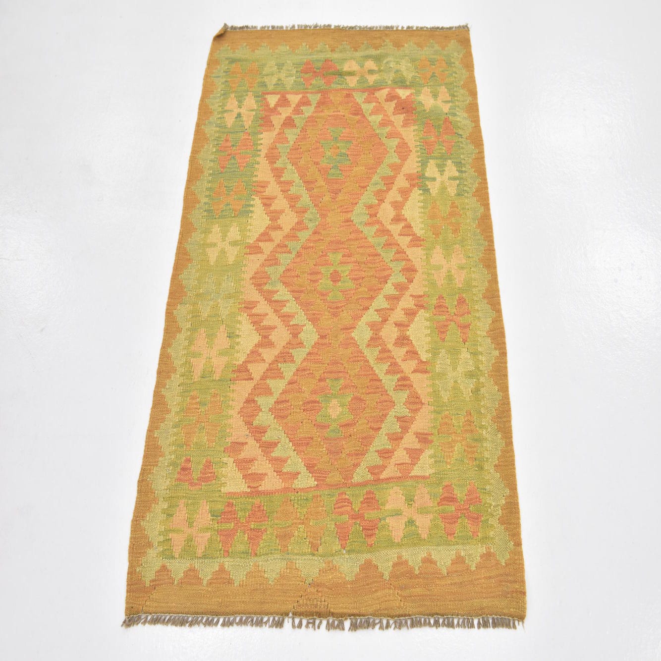 The texture is flat, typical of Kilim rugs, which lends itself to a variety of interior settings. The fringe on both ends adds an authentic and decorative touch. This rug would seamlessly integrate into spaces that appreciate a mix of bohemian charm and rustic elegance, such as a cozy living room, a welcoming entryway, or a study imbued with natural elements. It could also serve as a distinctive focal point in a minimalist or contemporary setting, providing a splash of color and artisanal flair.