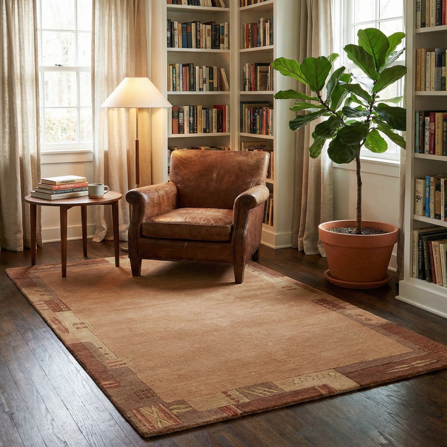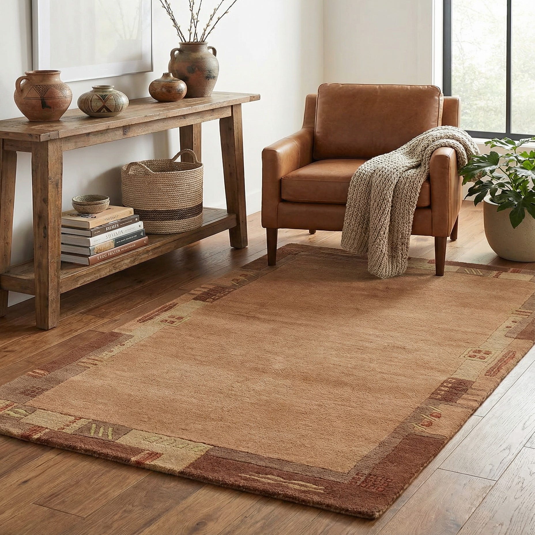 The Nepal Collection offers a hand-knotted 100% wool rug in a modest 3x5 size, presenting a warm peach backdrop that anchors the space with a soft and inviting tone. Accentuated by an array of detailed geometric and abstract motifs in a sophisticated palette that includes burgundy, red, and beige, this rug's design adds a distinct character without overwhelming the room.