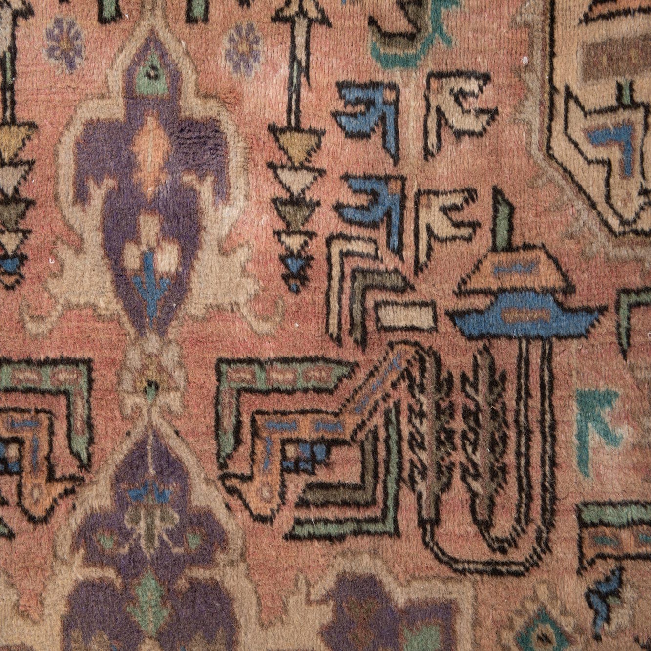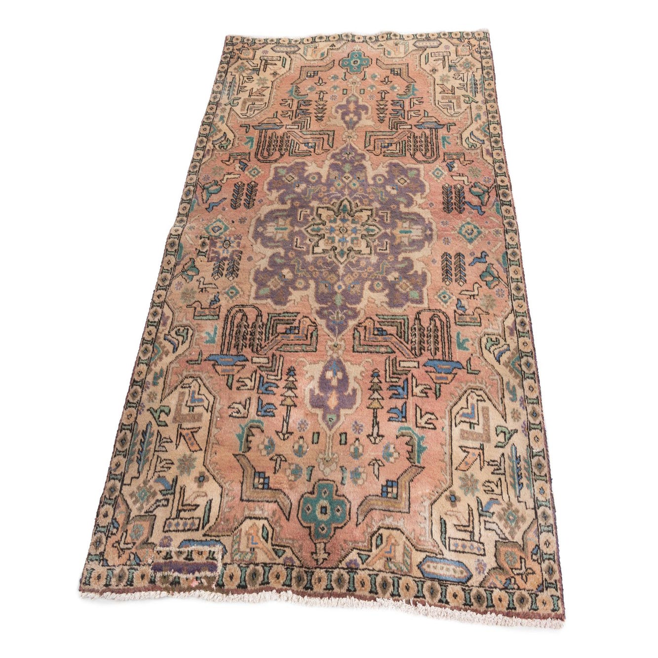 A vintage-inspired medallion rug in a warm peach field, this hand-knotted piece in 100% wool pairs a central purple medallion with layered geometric and floral motifs in brown, green and ivory. The border and corner motifs introduce small teal and ivory highlights that balance the softer peach ground, while darker brown outlines add crisp definition to the pattern. The overall palette is softly muted, giving the design an antique-washed character without appearing overly distressed.
