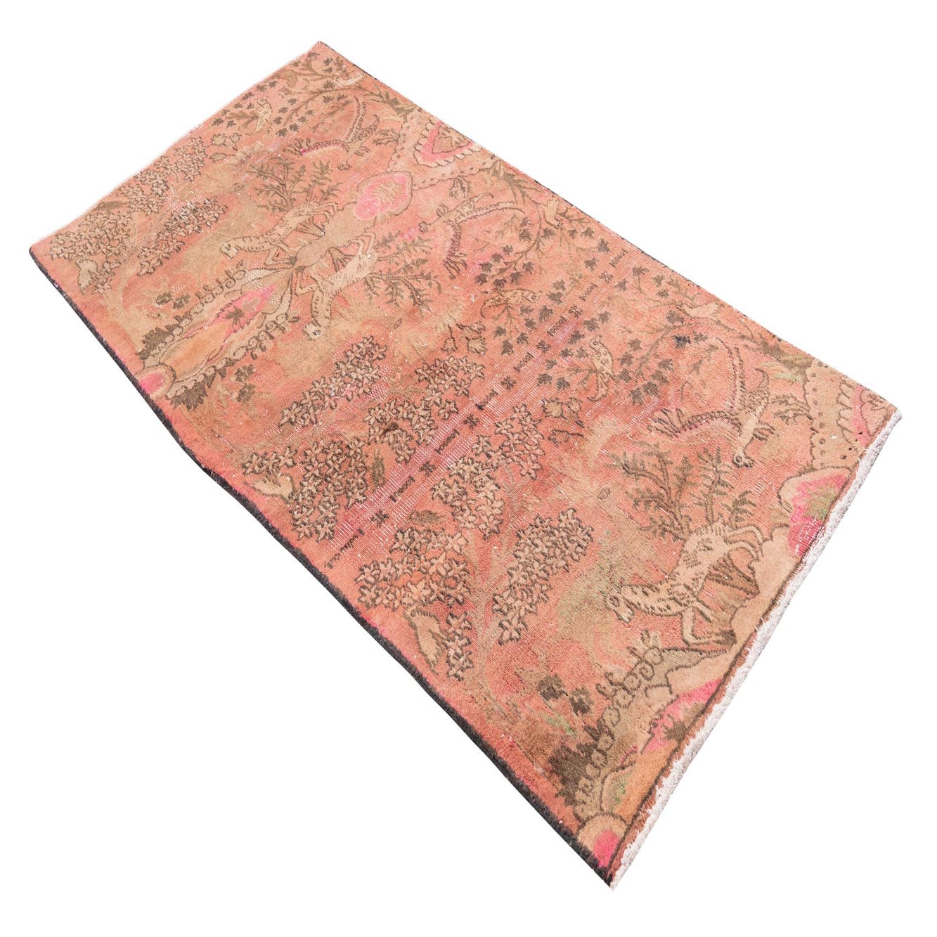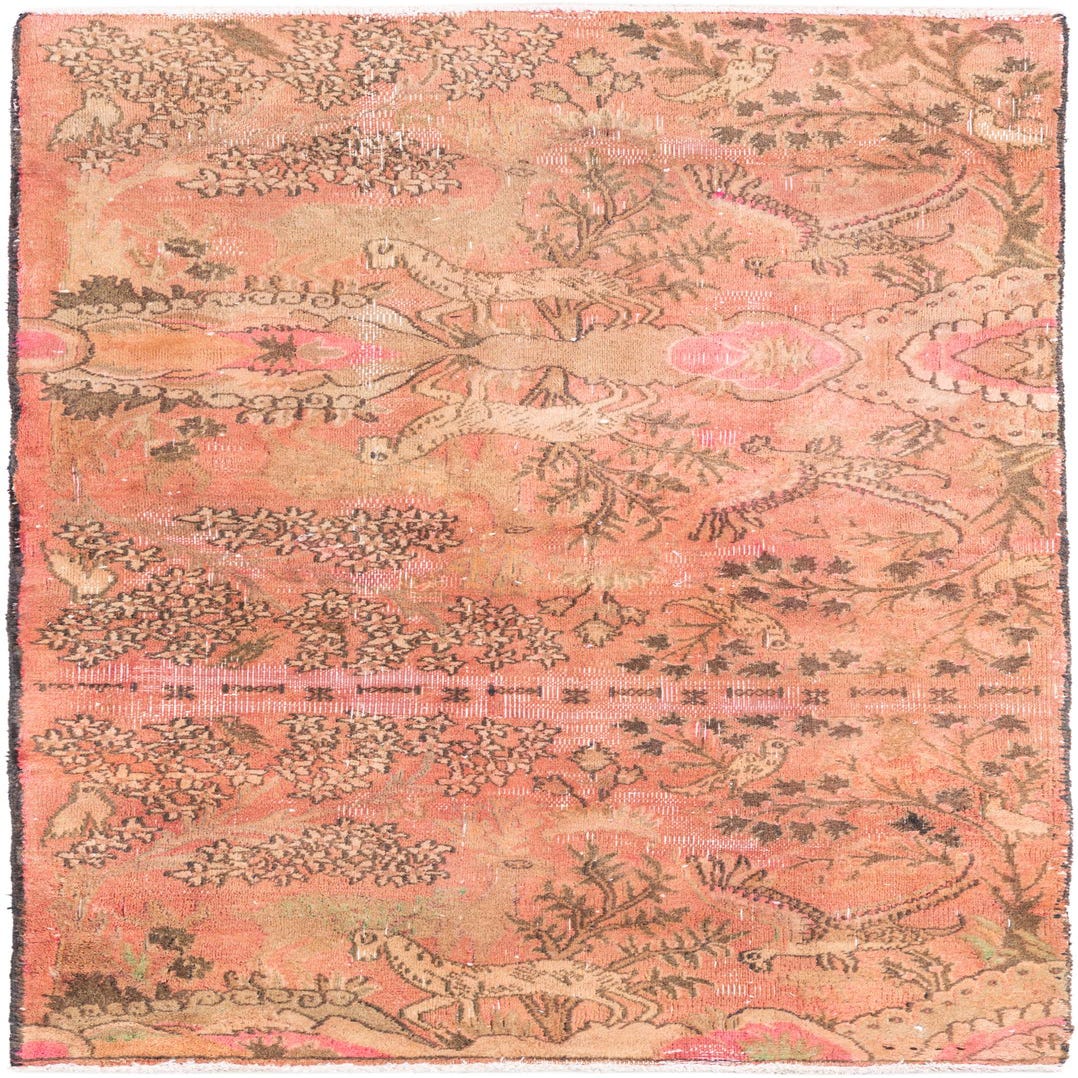 A 4x6 rectangular orange Persian rug with a faded vintage look, featuring intricate floral and animal patterns in muted browns and pinks.