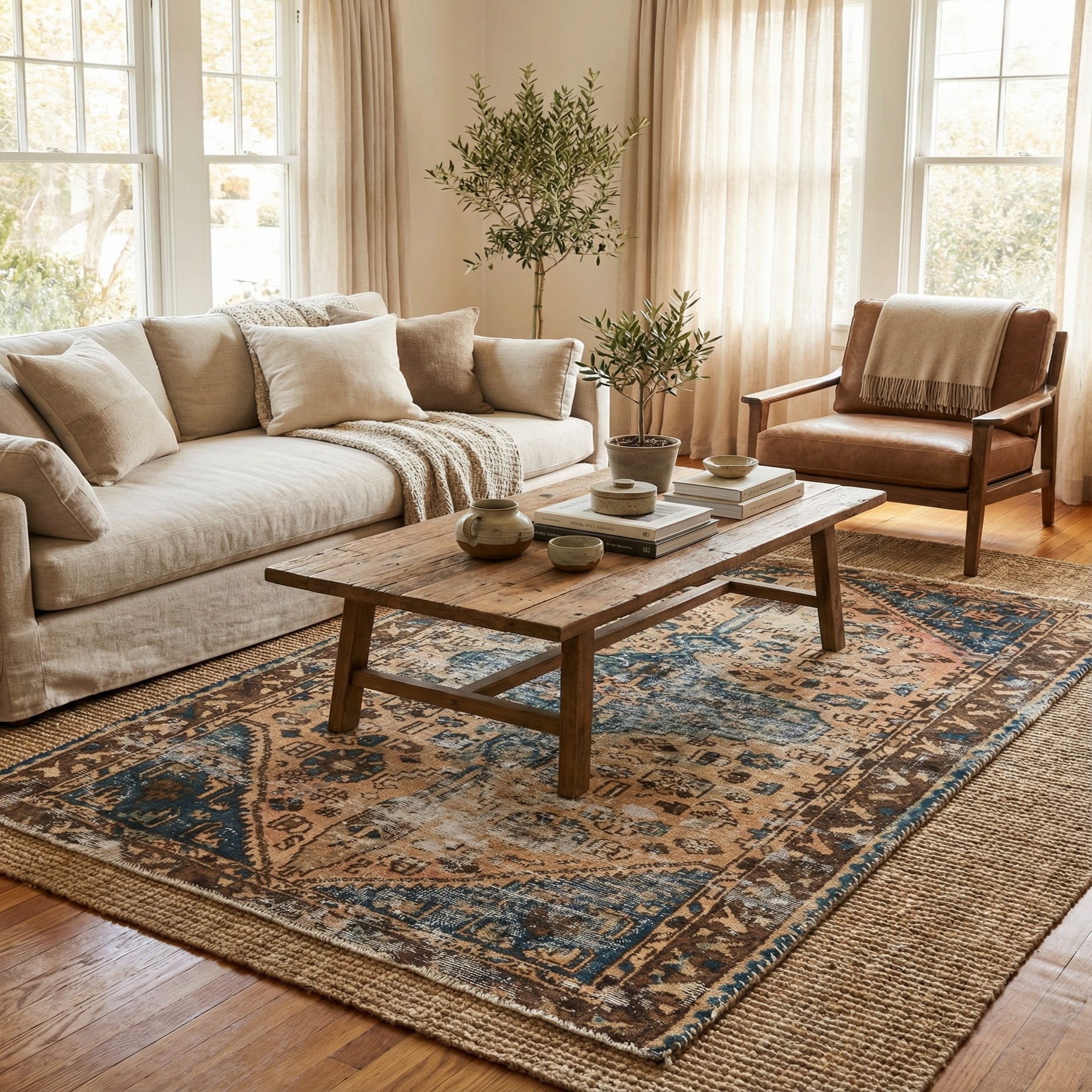 A rectangular 4x6 Ultra Vintage rug featuring a distressed Persian medallion pattern in shades of orange, blue, and brown.