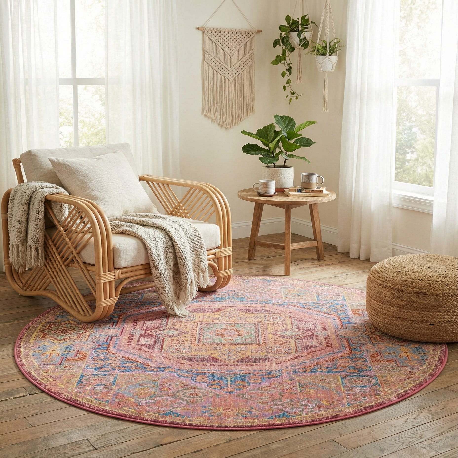 Machine-made from 100% polyester, the rug has a low-profile pile with a smooth, slightly satiny hand that feels soft underfoot while offering a neat, furniture-friendly surface. Use it as a focal point beneath a round dining table or in a cozy seating nook, tuck it under a bed to add color at the foot, or place it in an entry or powder room to introduce warmth and personality. It pairs nicely with light woods and rattan, brass or matte black accents, and layered textiles — especially in boho, eclectic, global, or transitional interiors where mixed color and pattern bring a room together.