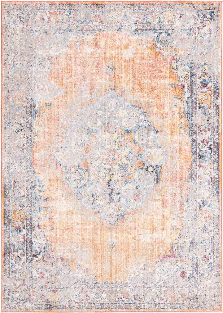 Primary color is Peach. Colors in this rug include: Peach, Blue, Gray, Ivory, Light Blue, Red, Yellow, Orange.