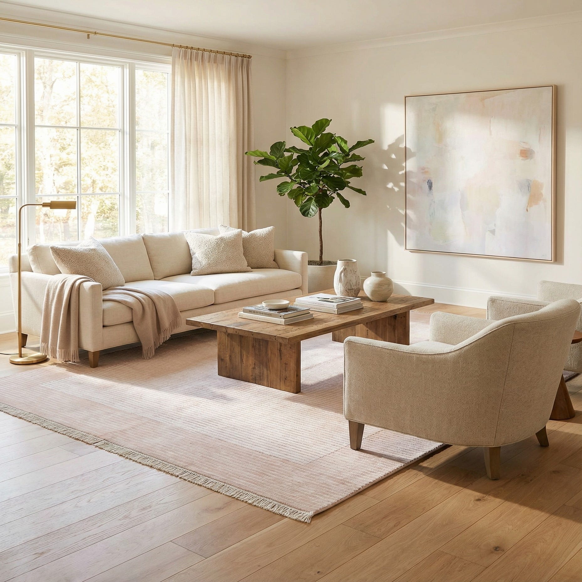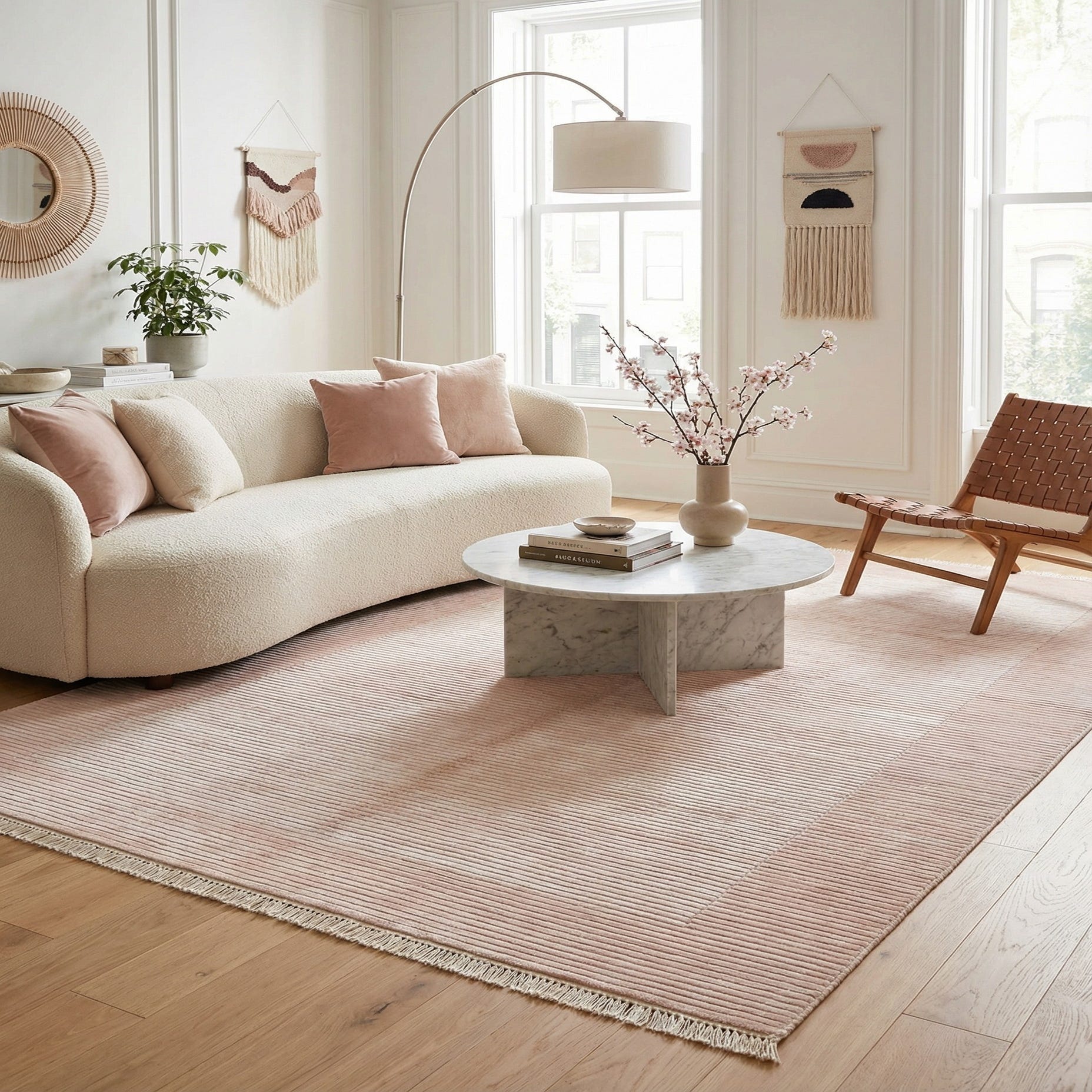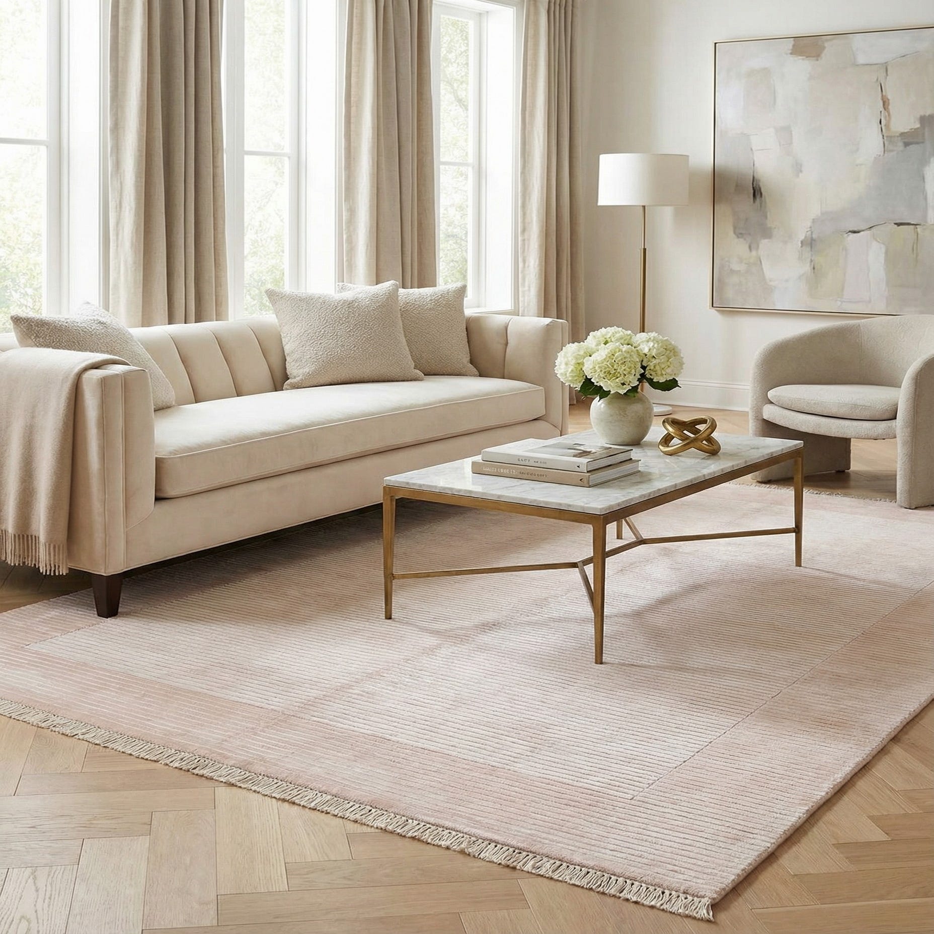 A 5x8 rectangular Darya rug in soft orange, featuring a subtle modern border and fringe, ideal for a living room.