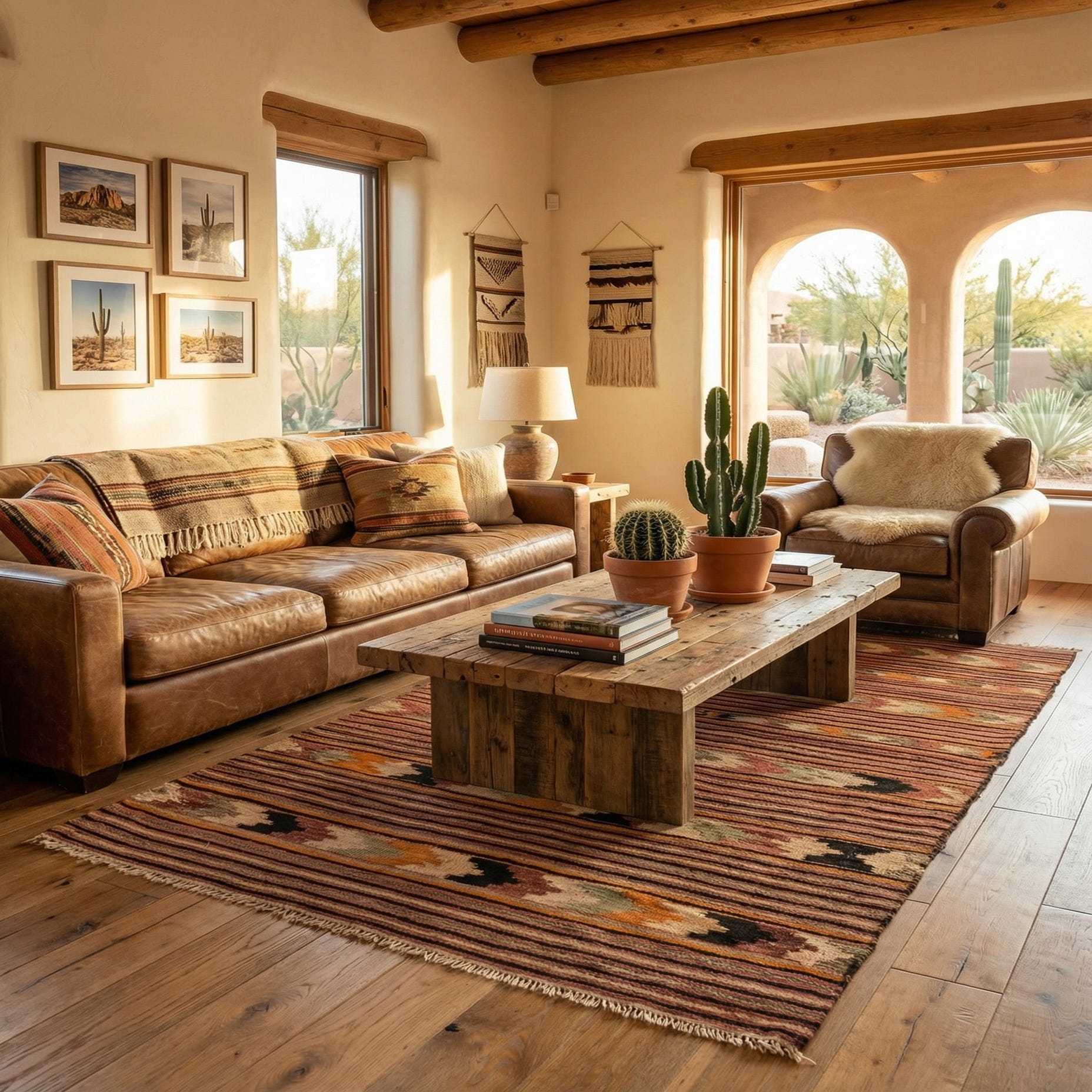 A 5x8 rectangular Kilim Fars rug with orange, brown, and black stripes and tribal patterns, handmade from 100% wool.
