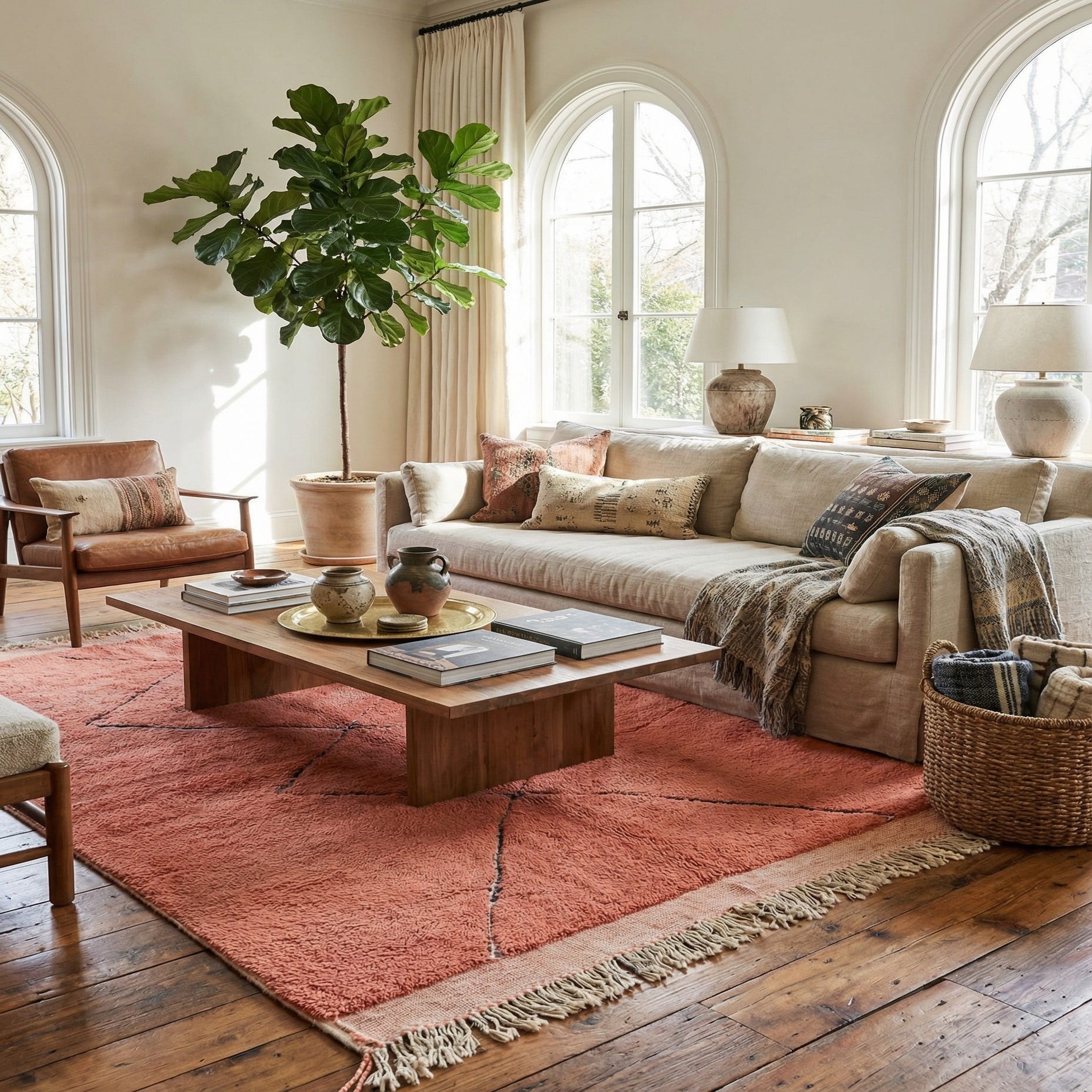 The rug's understated elegance makes it versatile enough to complement a variety of interior design themes. Suitable for spaces that lean towards a bohemian flair, it can also seamlessly integrate into minimalist decor to add a pop of color and texture. This piece can serve as a captivating focal point in a living room, a welcoming addition in a hallway, or as an anchor for furniture in an open-concept space.