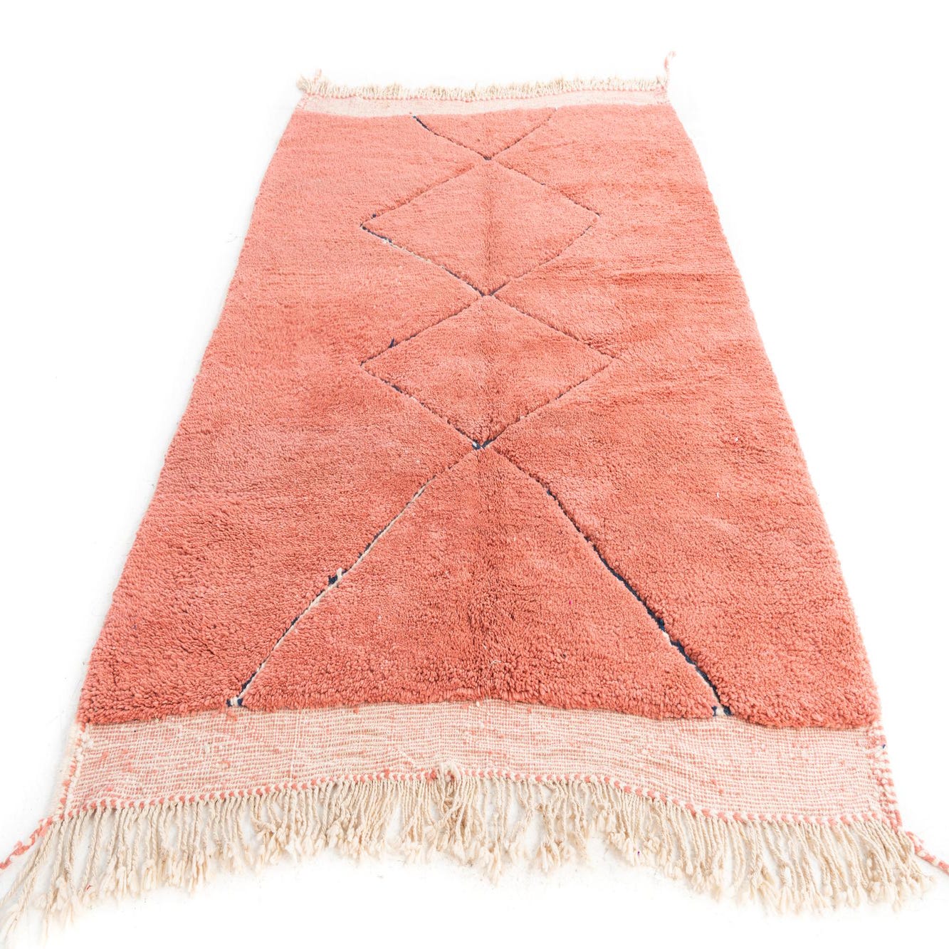 This Moroccan Collection hand-knotted rug embodies the traditional craftsmanship with a modern aesthetic. The 5x8 size showcases a simple yet striking pattern, featuring a series of diamond motifs in navy blue, woven against a peach background that adds a warm, subtle vibrancy to any room. Touches of ivory integrate a gentle contrast, enhancing the geometric design and providing visual depth.