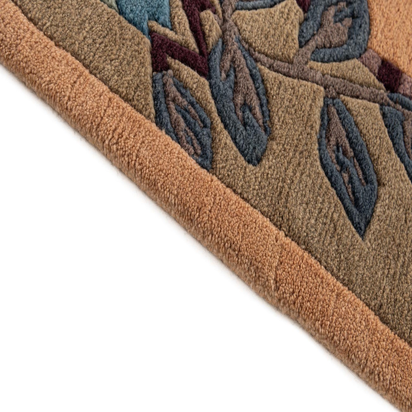 A 5x8 rectangular orange wool rug with a modern floral border in blue, green, and brown, suitable for a living room.