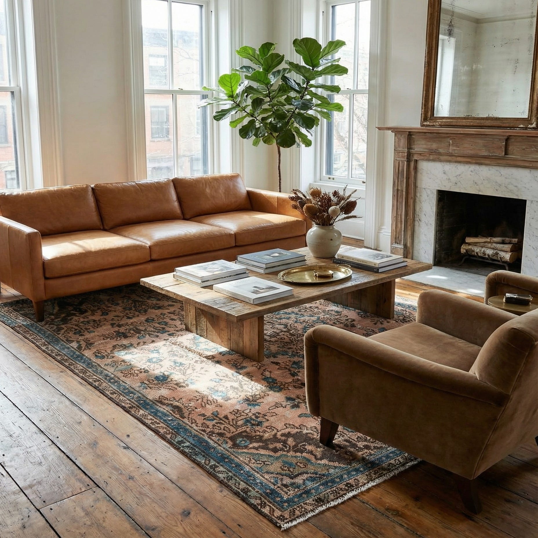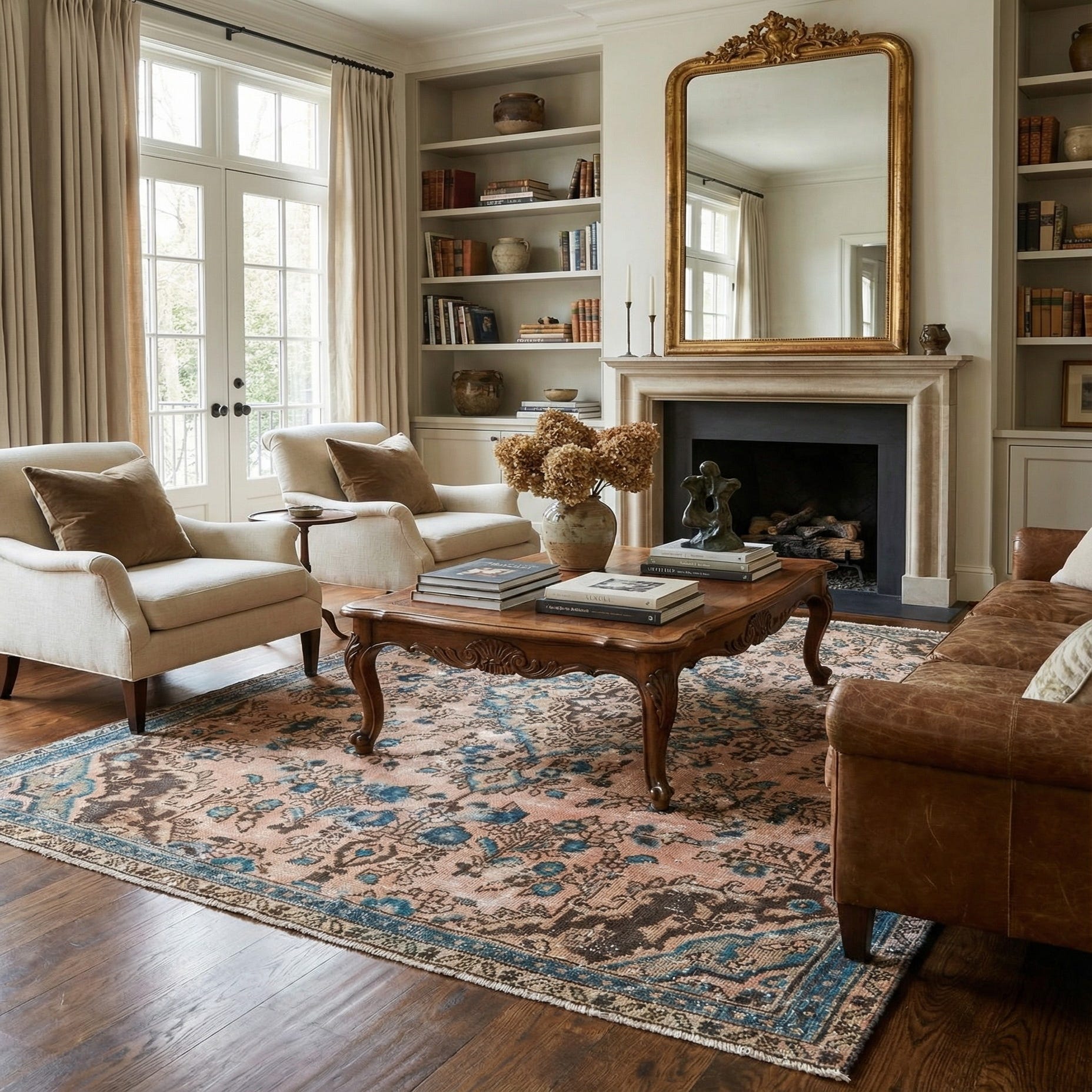 A rectangular 5x8 Ultra Vintage Persian rug with an orange and blue medallion pattern, suitable for a living room.