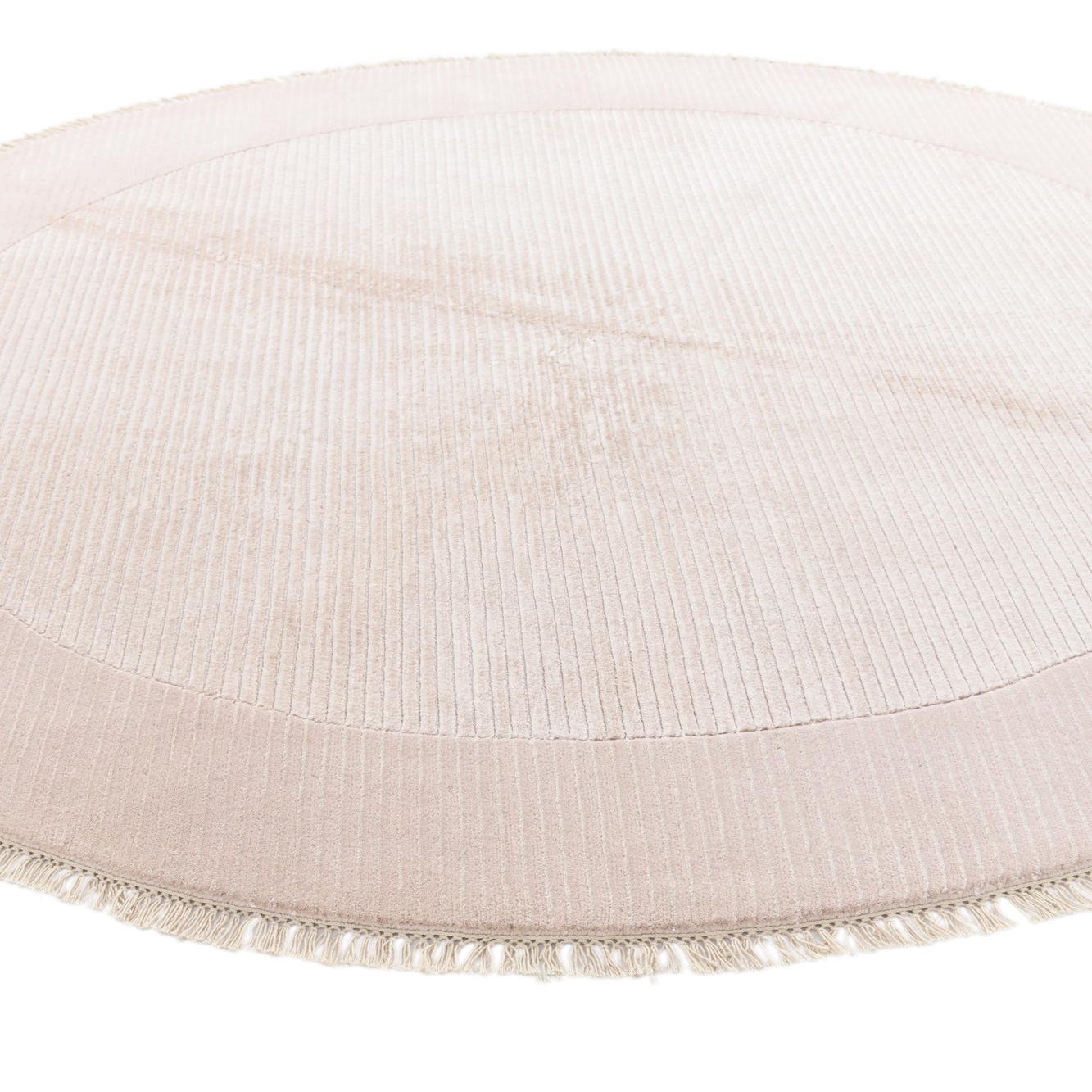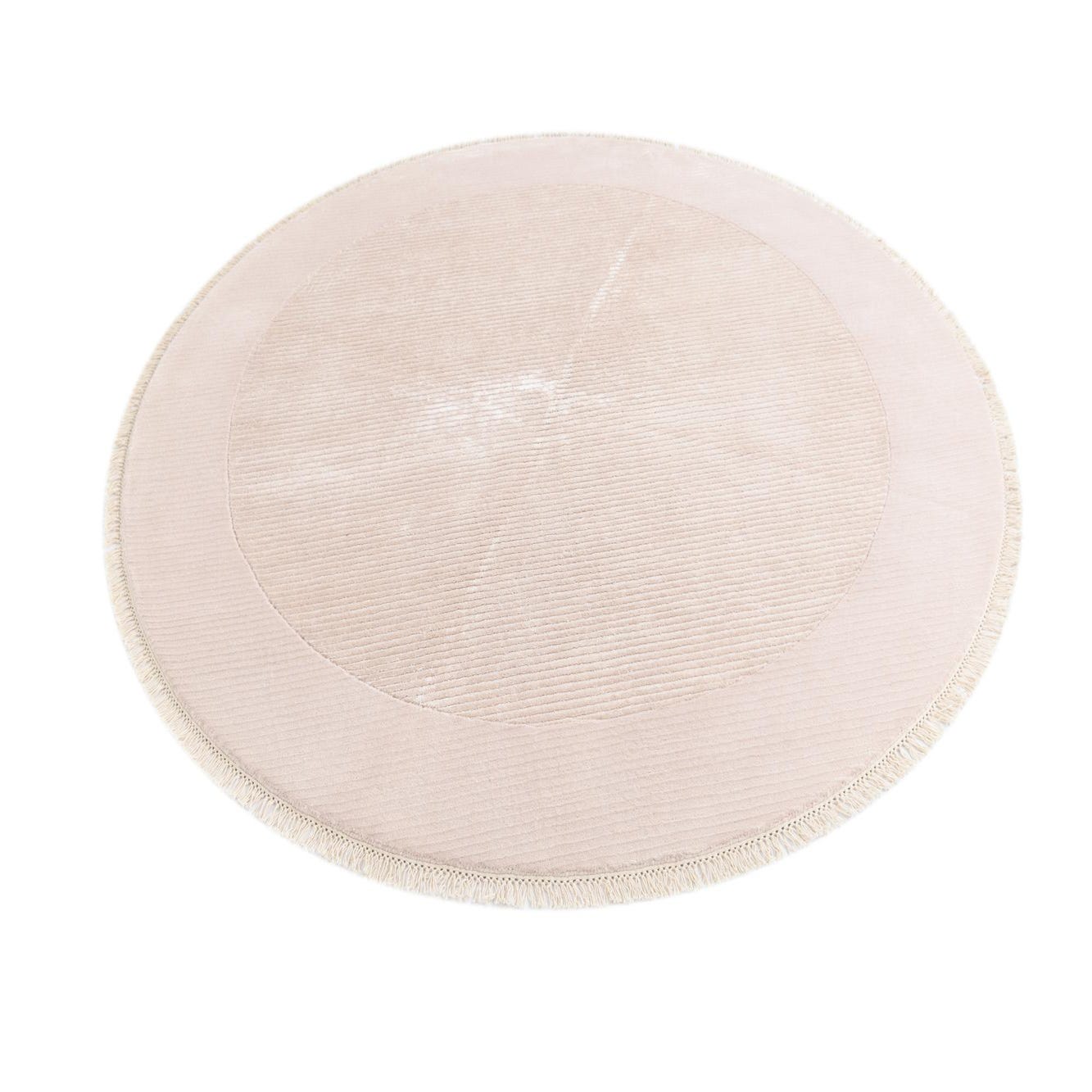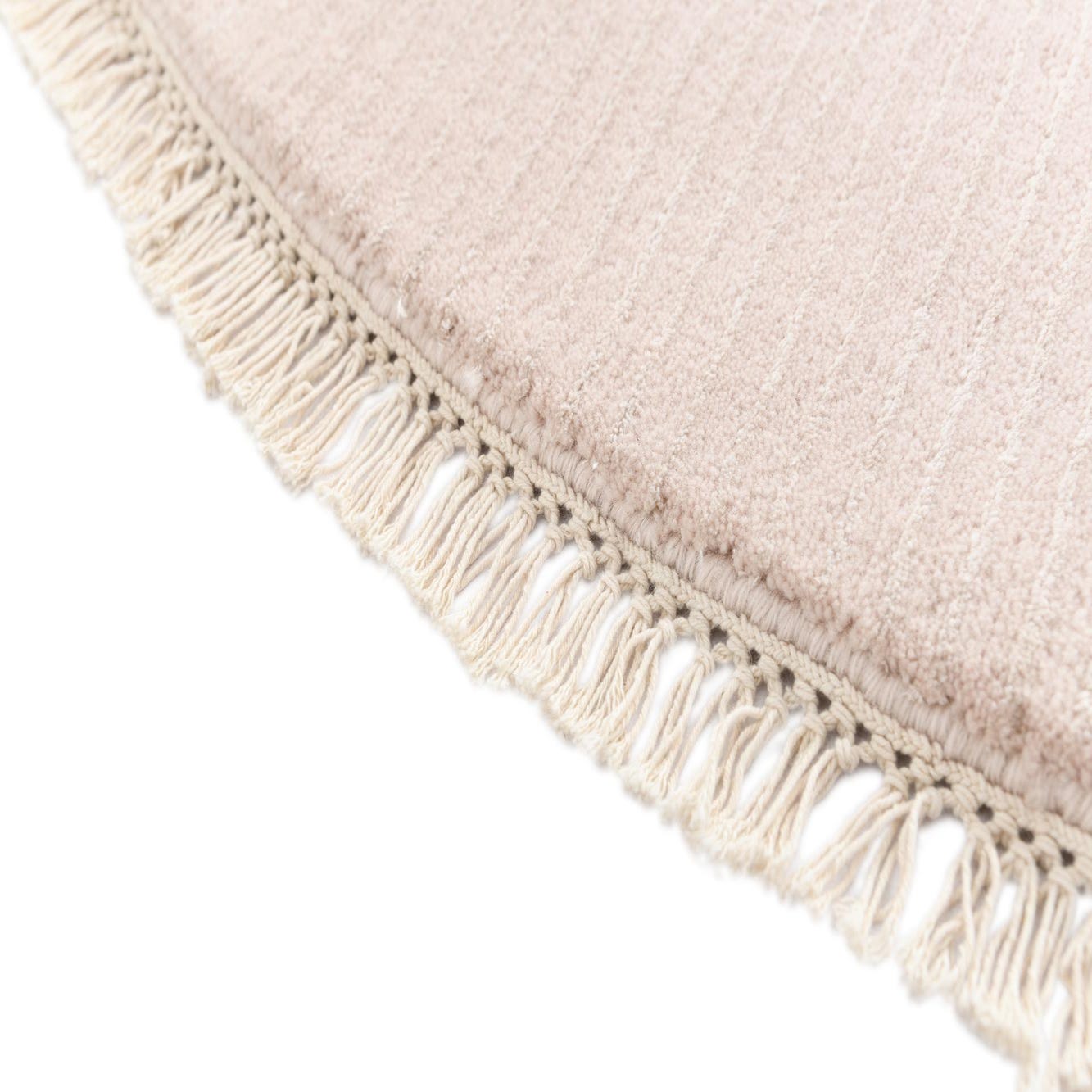 Framed with a tasteful fringe, the rug's edge adds just the right amount of detail, balancing tradition with a modern sensibility. The Darya's solid color scheme makes it an adaptable piece for a variety of interior design scenarios. It would work well in spaces aiming for a serene and calming ambiance, such as bedrooms, living rooms, or intimate seating areas. This rug would pair gracefully with both contemporary and traditional furniture, providing an understated backdrop that supports a range of color palettes and decor themes. Its round shape is especially fitting for anchoring arrangements with circular tables or highlighting the symmetry of a space.