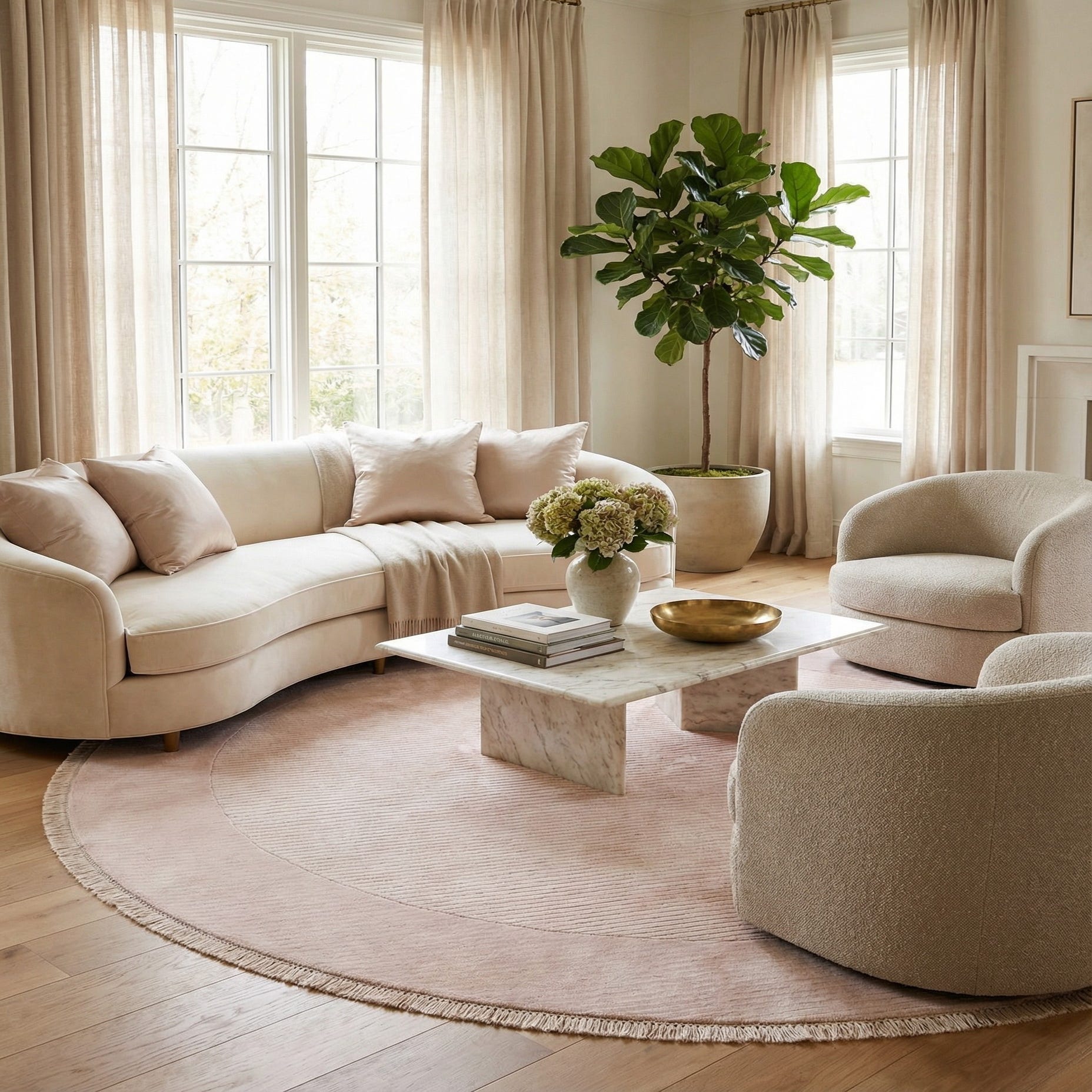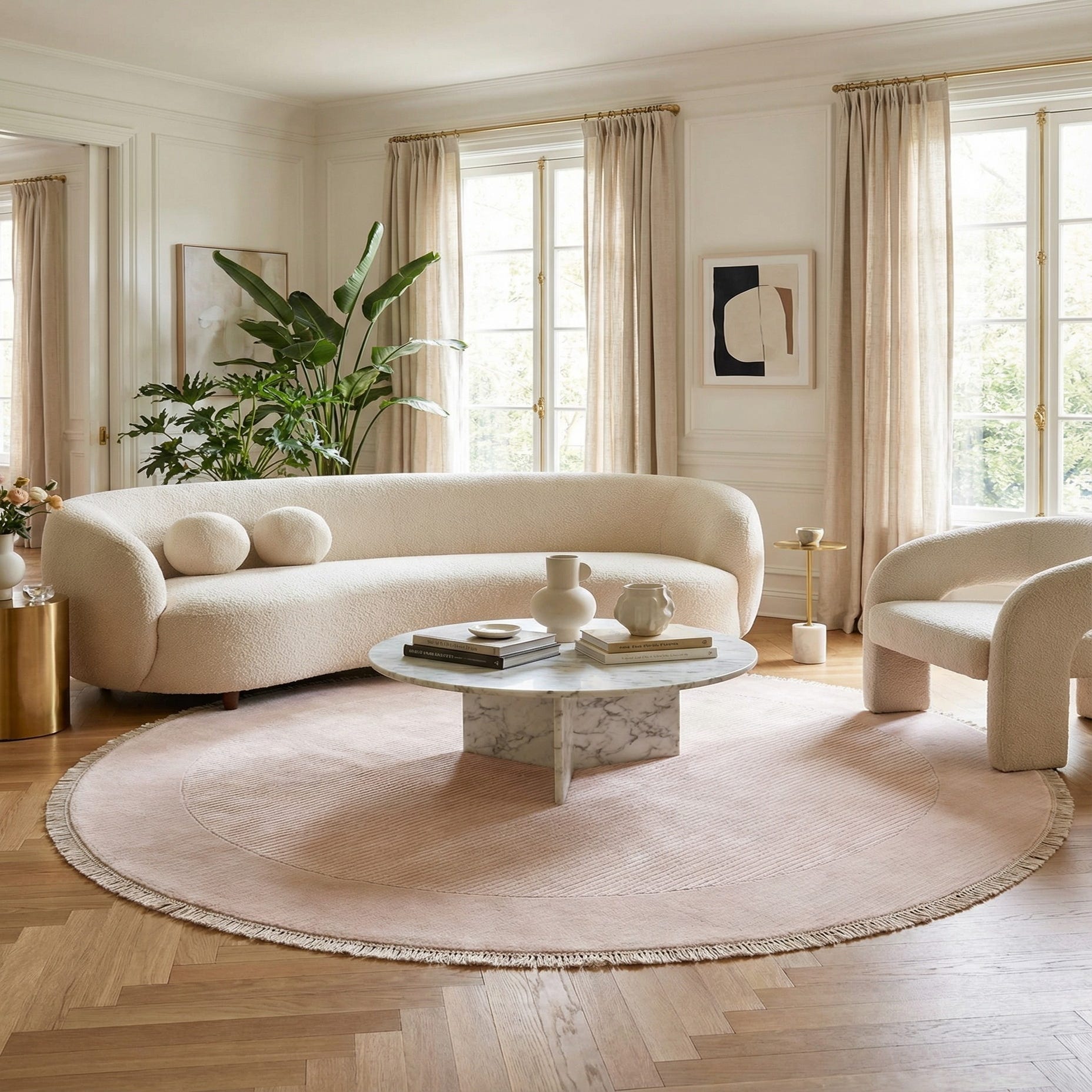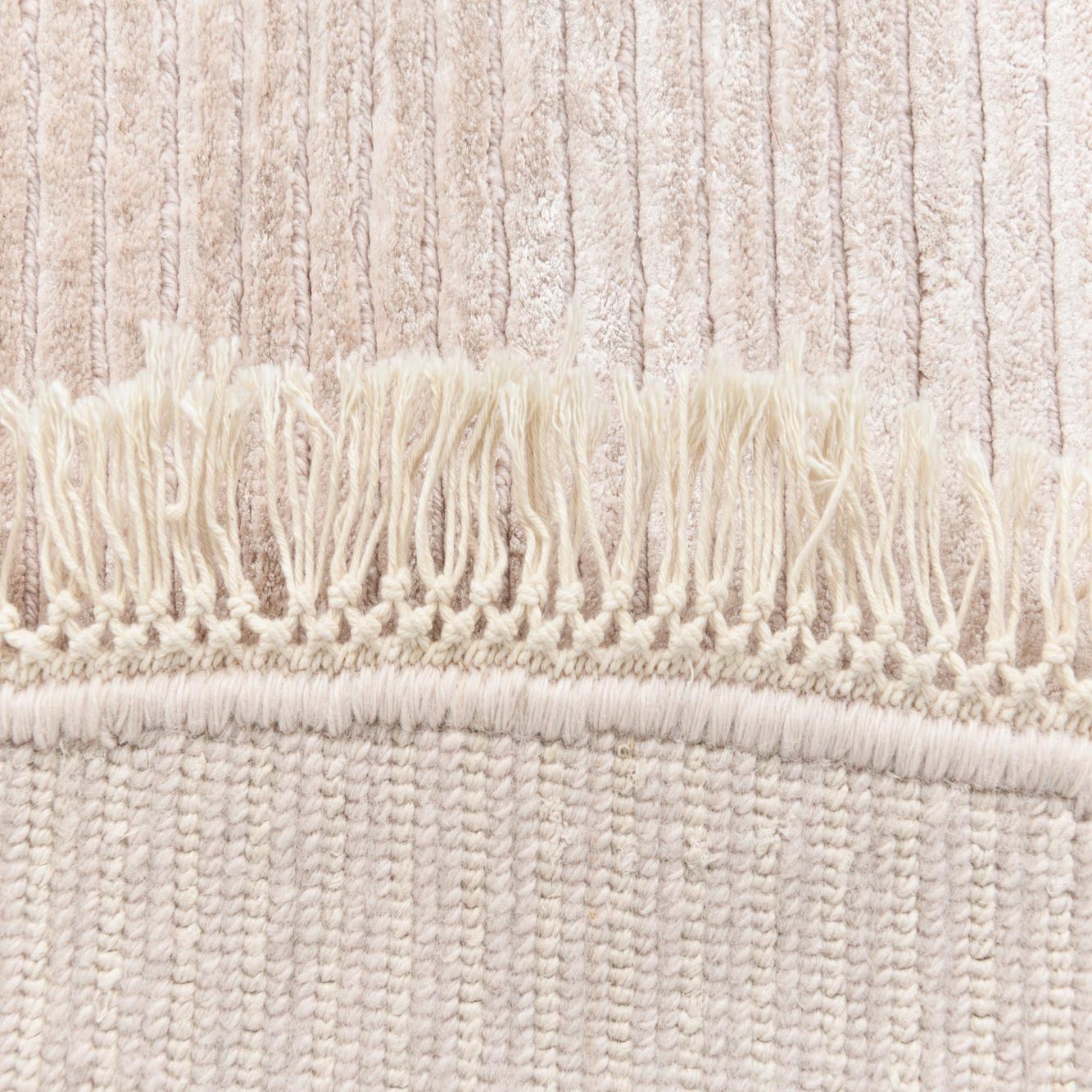 Framed with a tasteful fringe, the rug's edge adds just the right amount of detail, balancing tradition with a modern sensibility. The Darya's solid color scheme makes it an adaptable piece for a variety of interior design scenarios. It would work well in spaces aiming for a serene and calming ambiance, such as bedrooms, living rooms, or intimate seating areas. This rug would pair gracefully with both contemporary and traditional furniture, providing an understated backdrop that supports a range of color palettes and decor themes. Its round shape is especially fitting for anchoring arrangements with circular tables or highlighting the symmetry of a space.