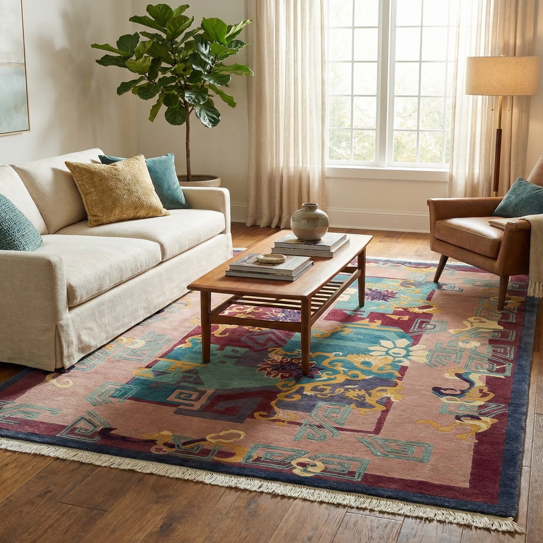 This piece works well in transitional and eclectic interiors where pattern and color are welcome: pair it with warm wood furniture and mid-century silhouettes for a balanced look, layer it in a bohemian living area with textured throws and mixed patterns, or use it to bring color and visual interest to a neutral bedroom or home office. It also holds up as an anchor in a dining room when you want a patterned, comfortable foundation beneath the table.