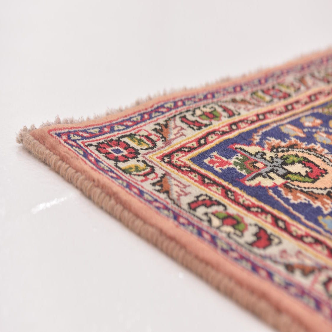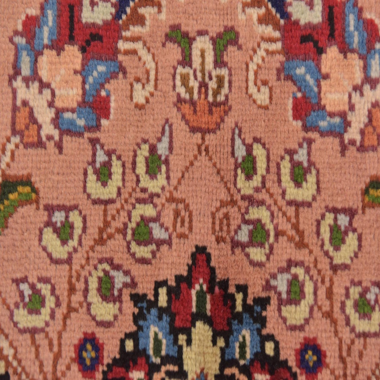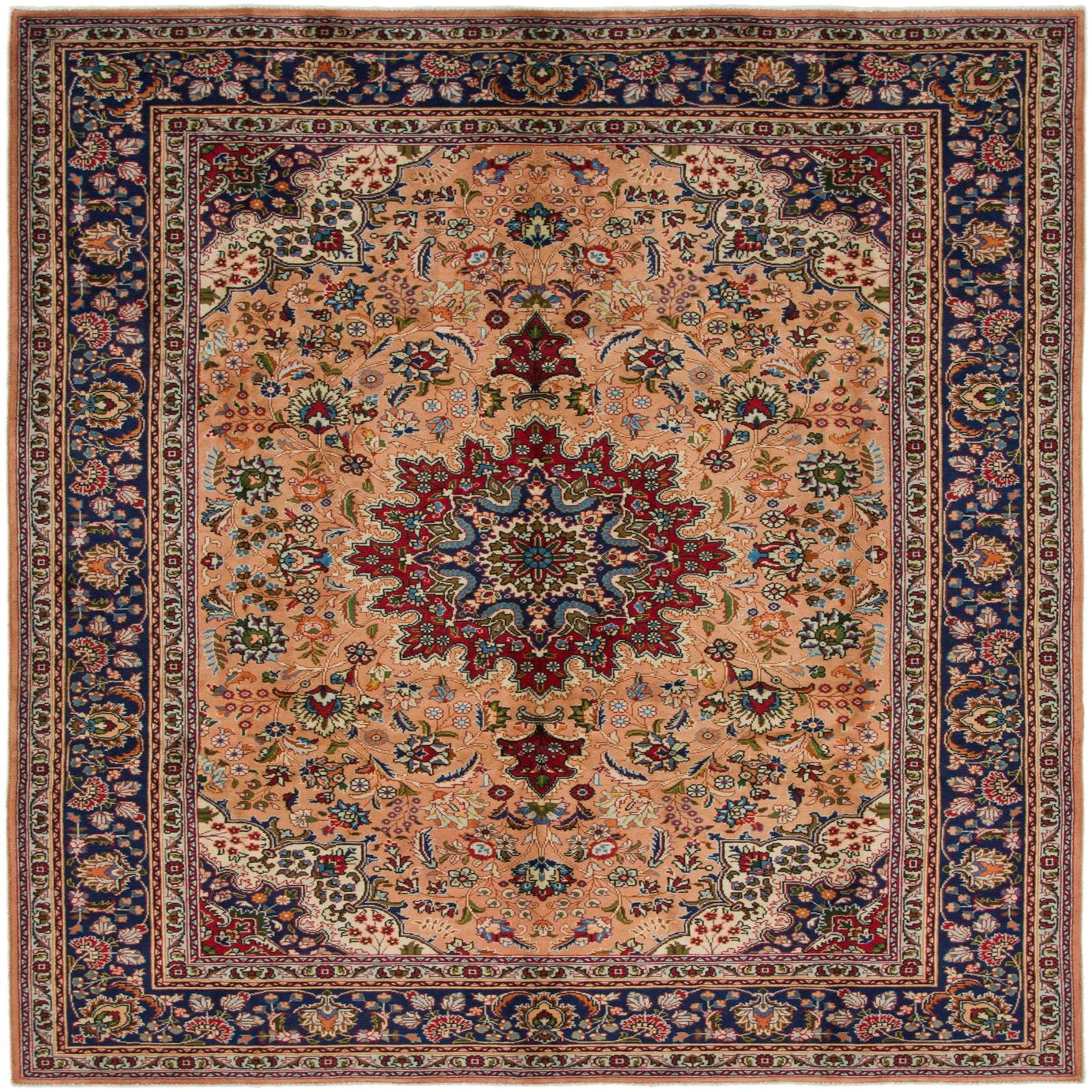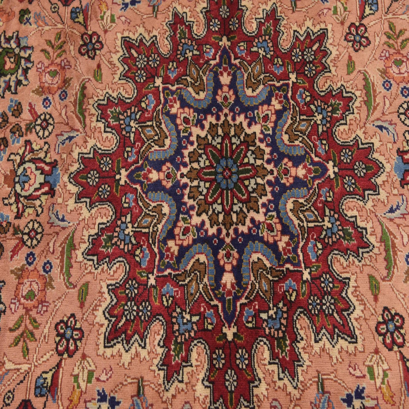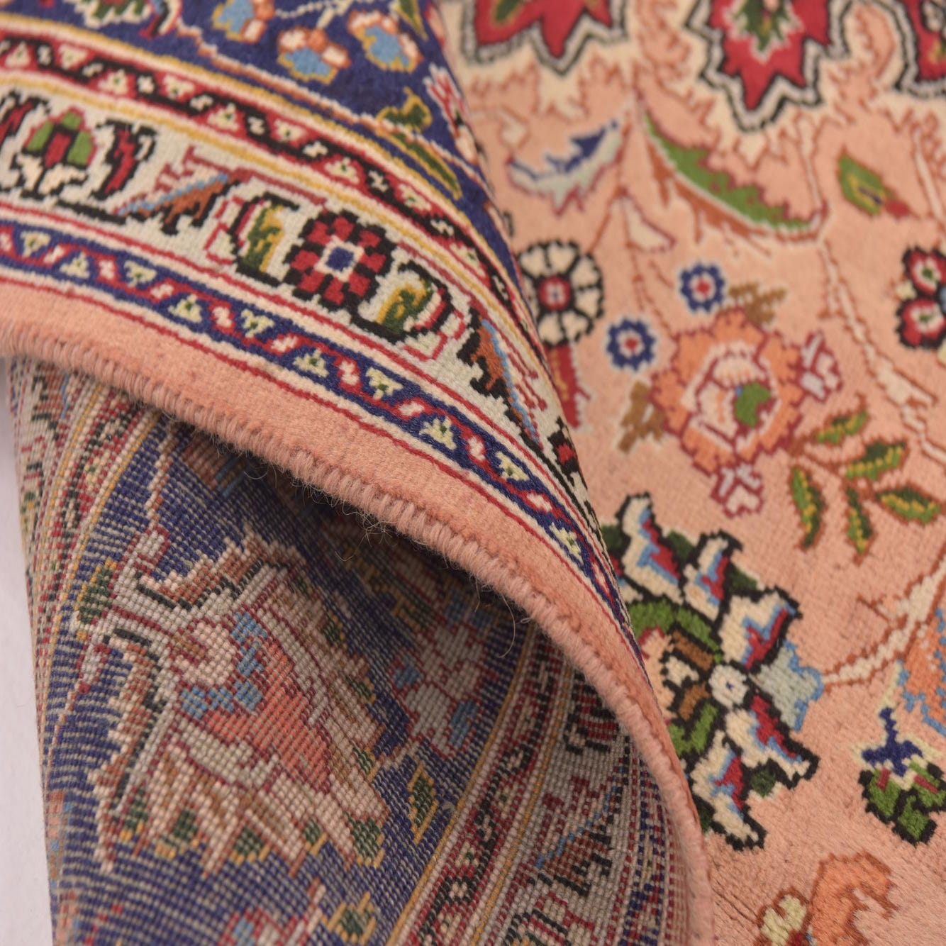The Tabriz collection hand-knotted rug is a testament to skilled craftsmanship and timeless design. Measuring 6x9 feet, this piece is woven from 100% wool, offering a durable and plush texture underfoot. It features a peach background, creating a warm and inviting foundation for the intricate pattern that adorns its surface.