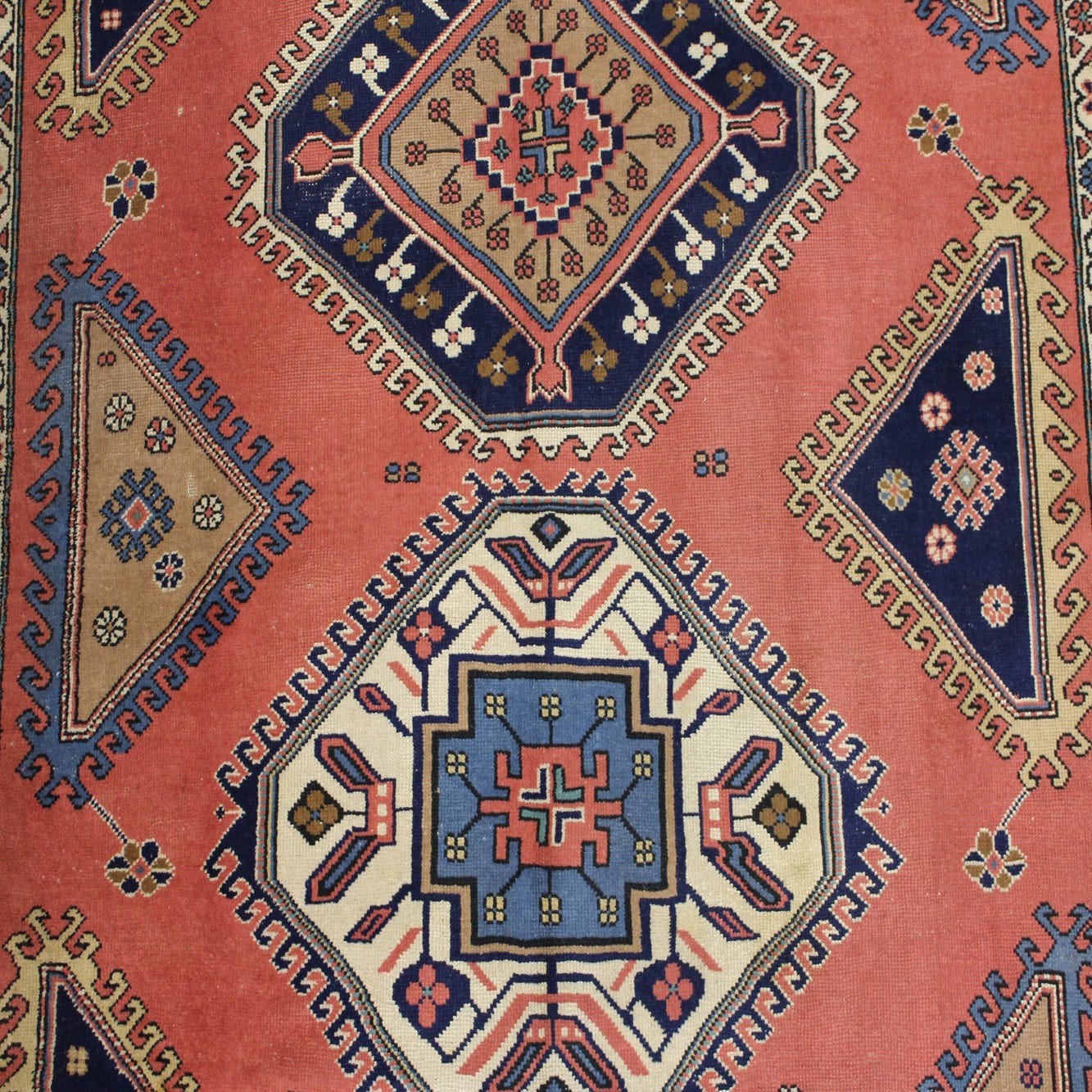 Primary color is Peach. Colors in this rug include: Peach, Ivory, Navy Blue, Beige, Brown, Blue.