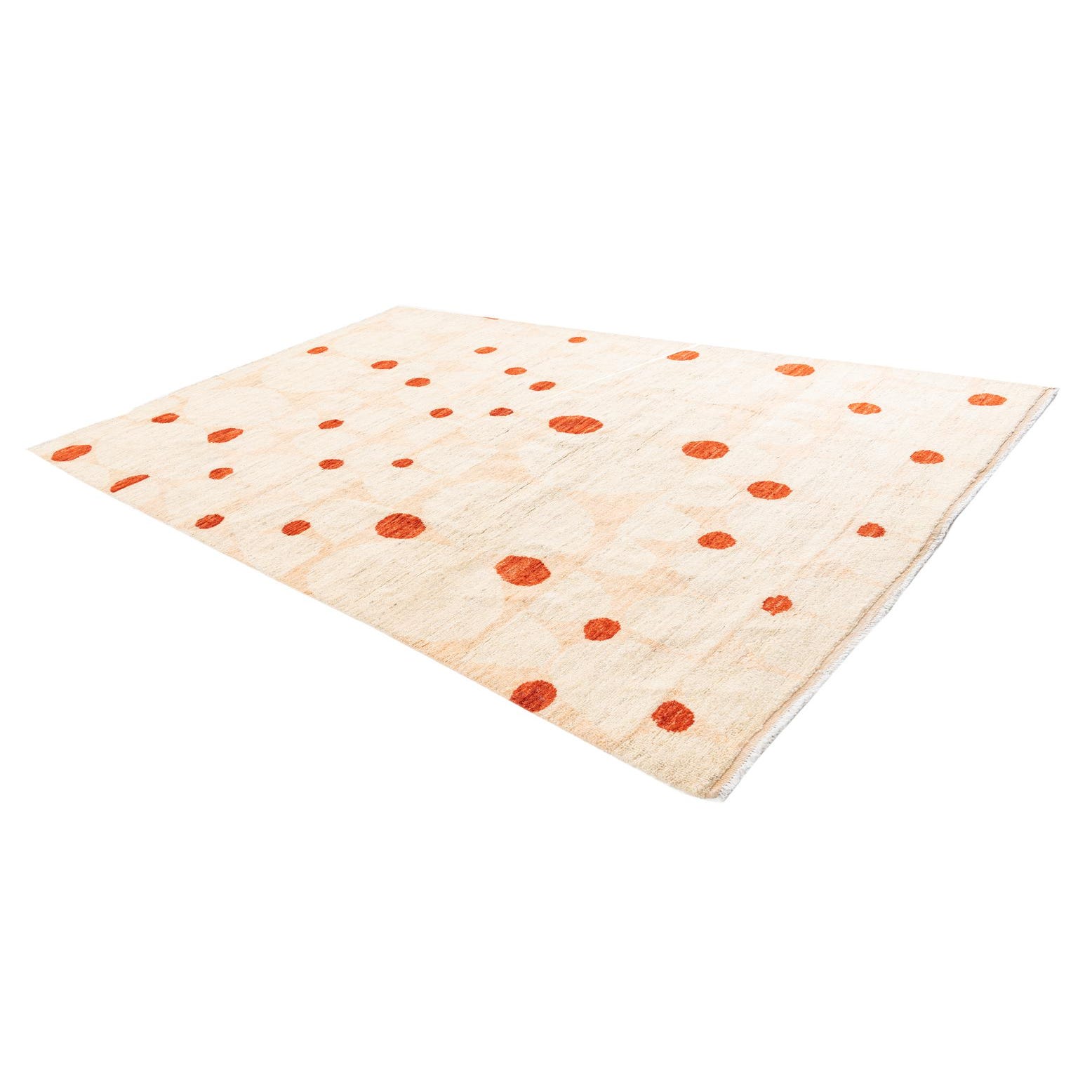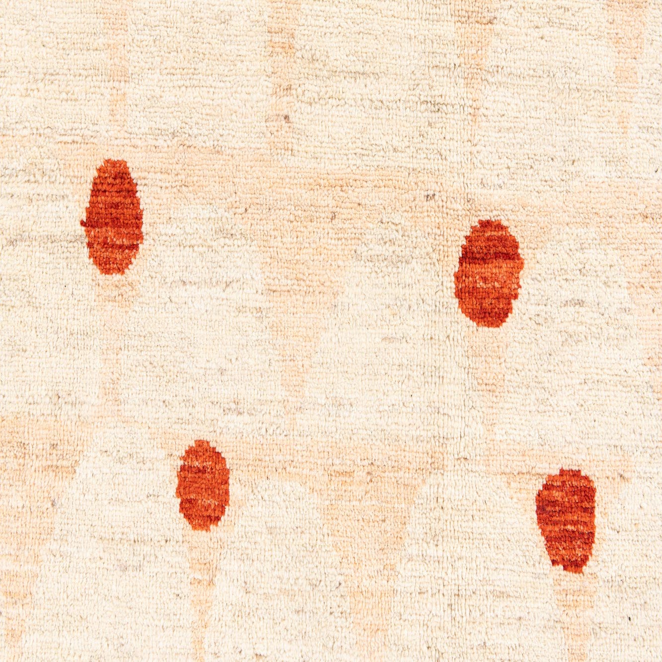 Primary color is Peach. Colors in this rug include: Peach, Ivory, Red.