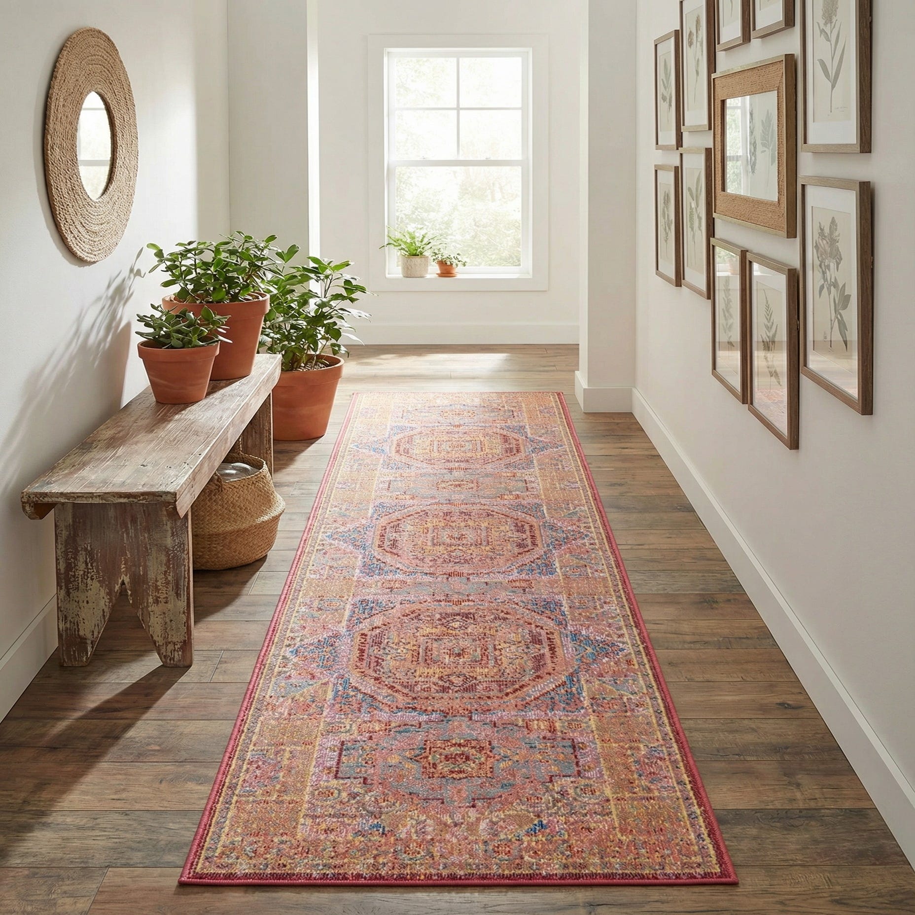 This runner is well suited to hallways, entryways, or alongside a kitchen island where you want a touch of pattern and color without overwhelming the space. It pairs nicely with warm wood tones and painted cabinetry, layered over neutral tile or wide-plank flooring, and complements eclectic, bohemian, or modern-traditional interiors. Use it to bring soft color into a narrow space or to tie together furniture groupings with both cool and warm accents.