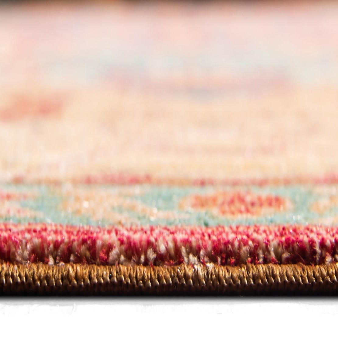 Primary color is Peach. Colors in this rug include: Peach, Beige, Blue, Burgundy, Gray, Light Blue, Light Brown, Orange, Puce, Yellow.