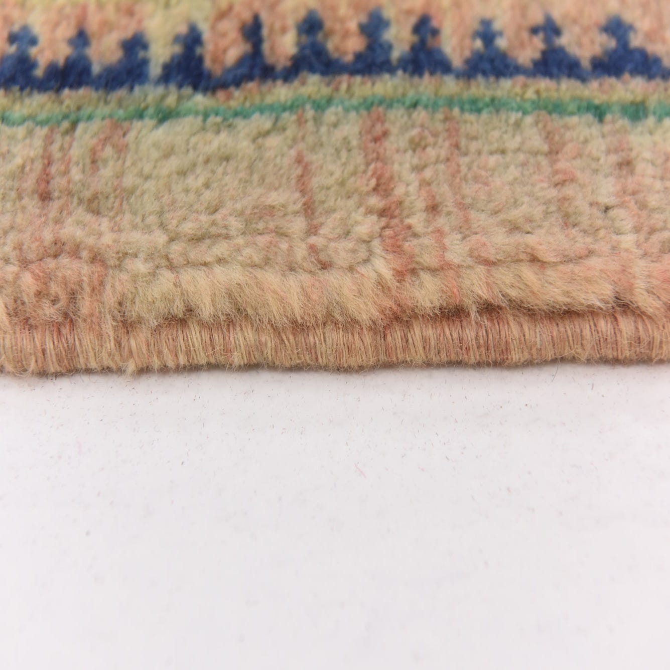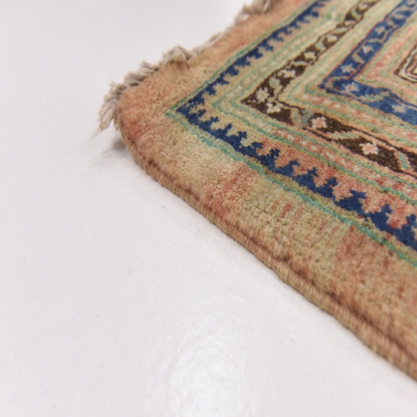Primary color is Peach. Colors in this rug include: Peach, Blue, Hunter Green, Ivory, Navy Blue, Olive, Turquoise, Tan.