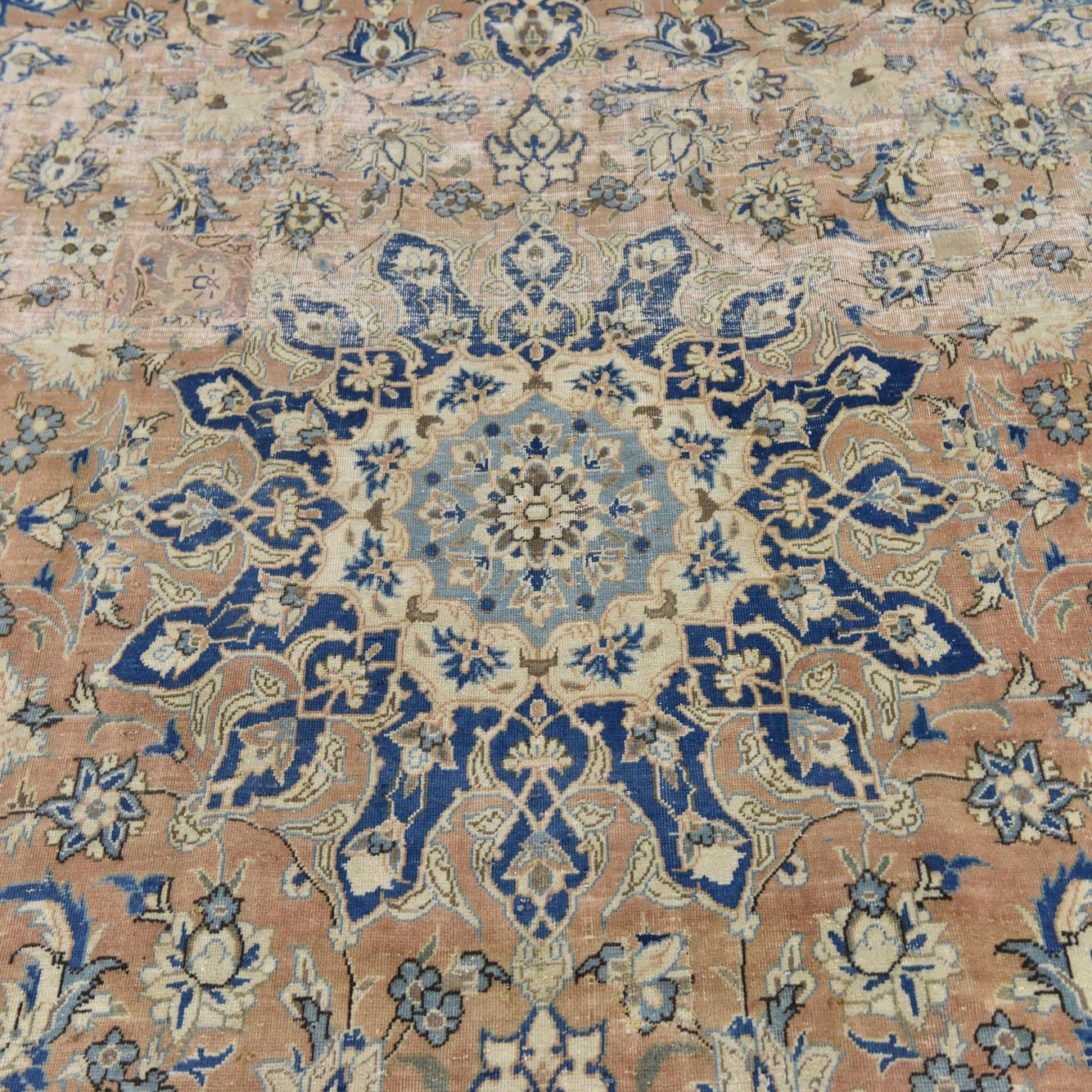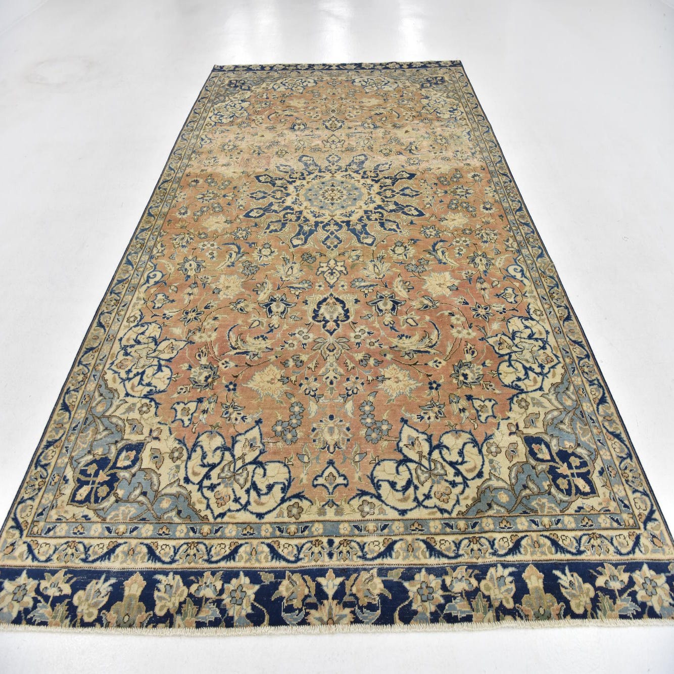 An 8x12 rectangular orange Persian wool rug with a central medallion and intricate blue and beige floral patterns.