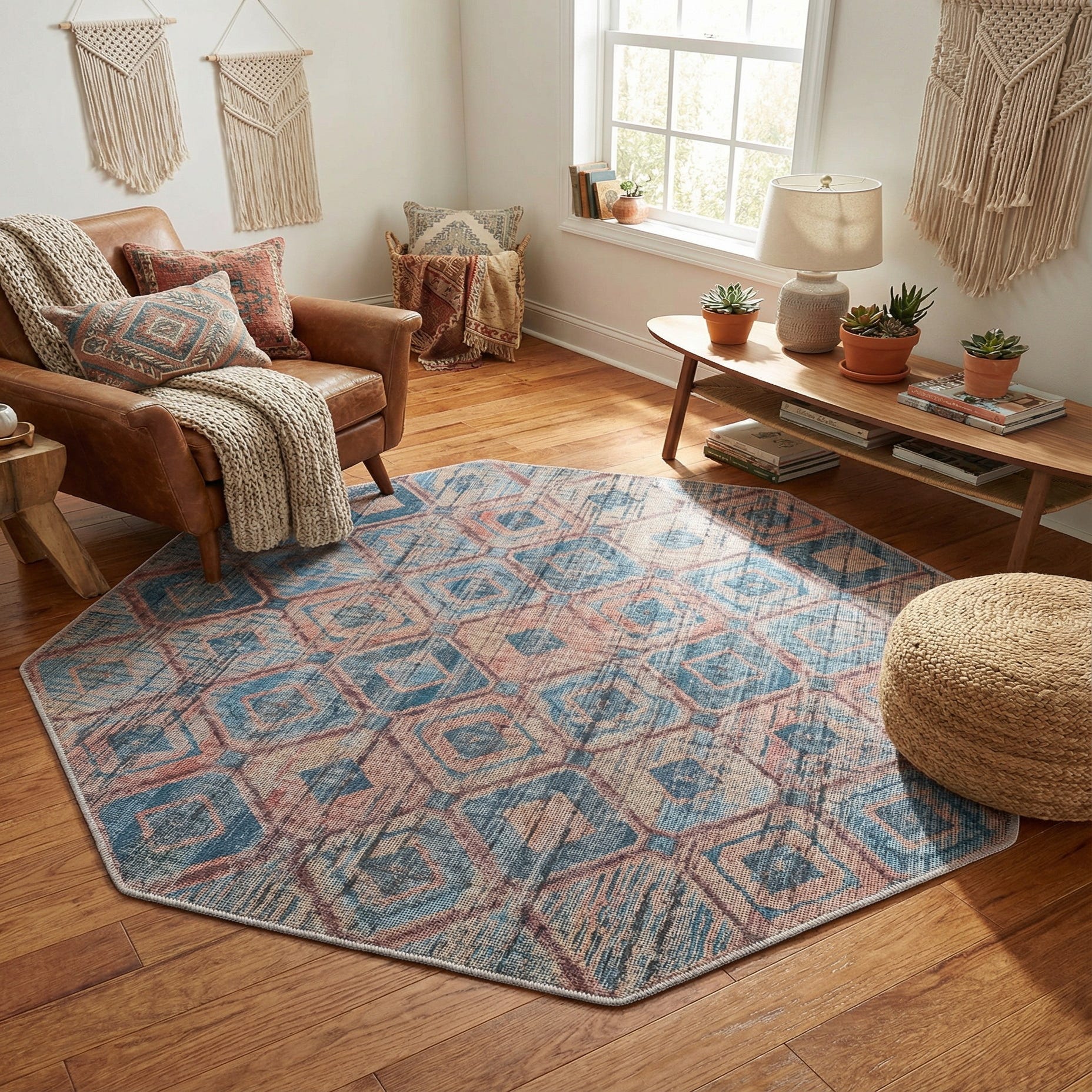 This rug suits a variety of interiors: place it beneath a small dining set or round table to emphasize the octagonal form, anchor a cozy seating nook in a living room, or set it in an entryway for a casual focal point. Pair it with mid-century furniture and walnut tones for a retro-modern look, use navy and neutral textiles for a coastal or cottage feel, or layer it over hardwoods to introduce shape and subtle color to an eclectic or transitional space.
