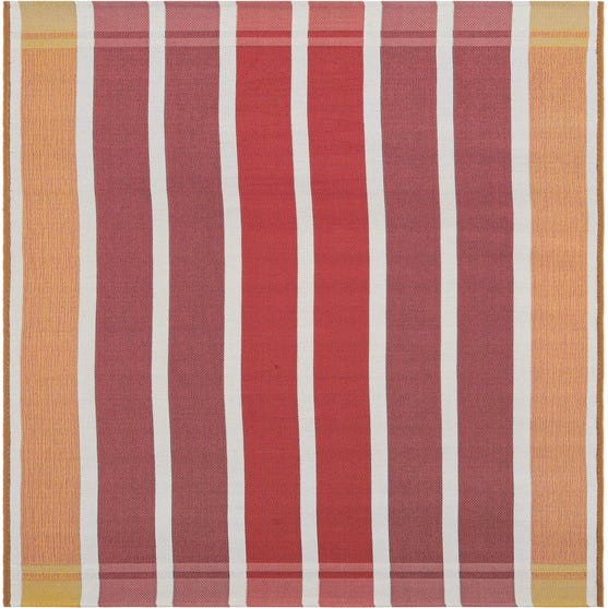 The Outdoor Ribbon collection presents a 10-foot runner rug with a contemporary striped pattern, comprising hues of peach and salmon, ivory, puce, and red, set against a warm peach and salmon background. The design is clean and linear, offering a modern aesthetic that can complement both outdoor and indoor settings. The machine-woven construction of 100% polypropylene ensures durability and resistance to wear, making this rug an ideal selection for high-traffic areas.