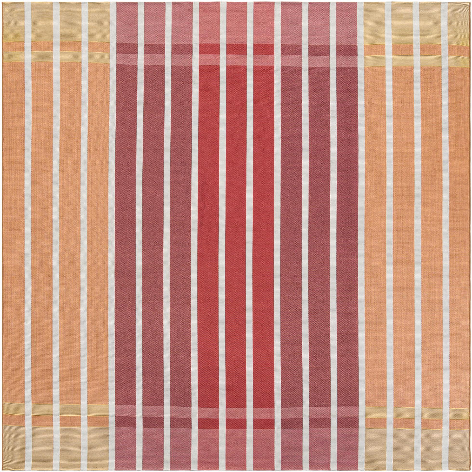 A 10'x10' square Rugs.com Outdoor Ribbon rug featuring modern vertical stripes in varying shades of orange, pink, and white.