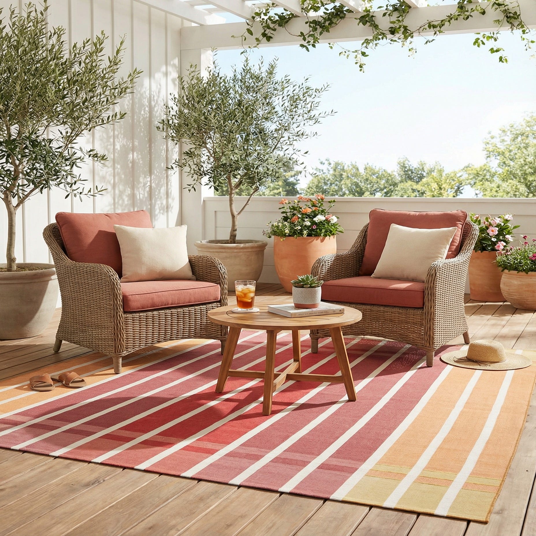Machine made of 100% polypropylene, the rug has a low-profile, flatweave construction that feels firm and even underfoot. The smooth surface and tightly woven texture make the colors appear clear and well-defined, while the synthetic fiber keeps the pile low and manageable for outdoor or high-traffic settings. Pair it with natural rattan and linen for a relaxed patio dining area, place it beneath a glass-top table in a sunroom to introduce color without visual clutter, or use it to ground a modern living space with warm-toned accents and clean-lined furniture.
