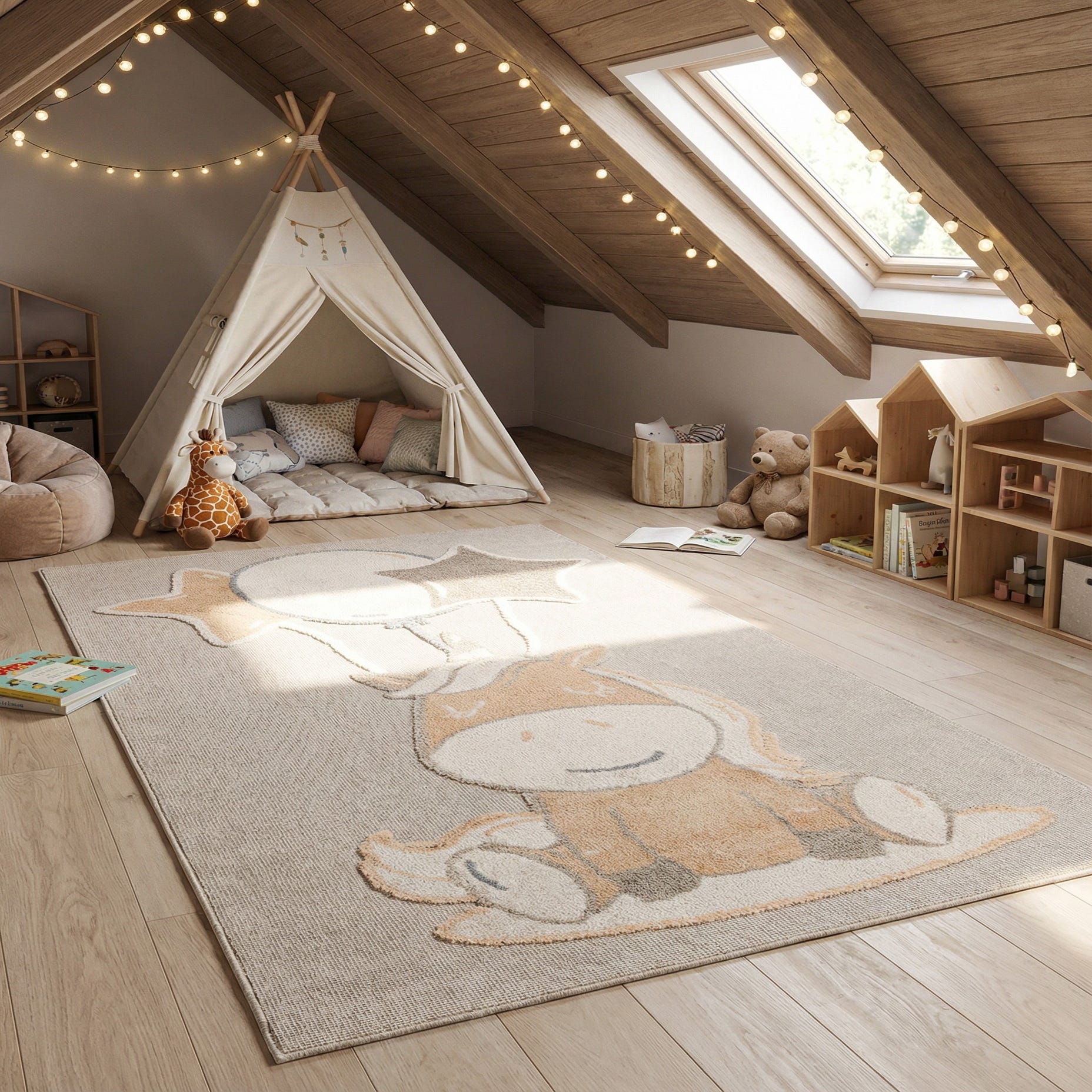 Machine made from 100% polypropylene, this rug balances durability with a soft hand, making it easy to place wherever a touch of charm is wanted. It fits naturally in a nursery or child’s bedroom, adds warmth to a playroom or reading nook, and layers well in light, pastel-oriented interiors such as contemporary Scandinavian or modern farmhouse spaces.