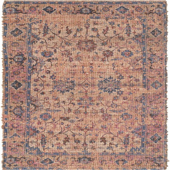 Hand-woven of polyester chenille and jute, this runner pairs a soft chenille surface with a tactile jute weave for a layered, textured feel. The design is an oriental-inspired field with a central medallion and narrow border, rendered in a gently distressed finish. A peach pink ground sets the stage while beige and brown form the structural motifs, and touches of red and violet appear as lively accents. Running your hand across it, you’ll notice the soft, velvety chenille threads against the slightly slubby, natural jute—a pleasing contrast between plush and rustic textures.