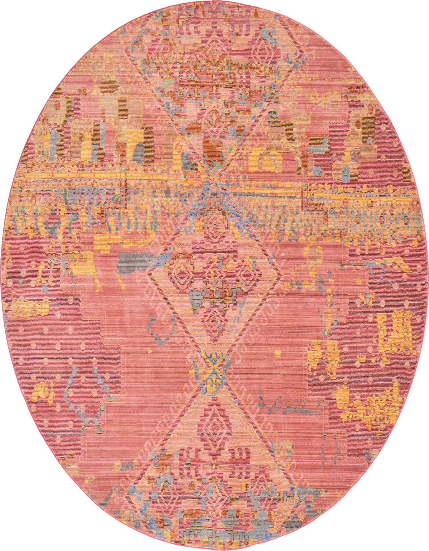 Primary color is Peach. Colors in this rug include: Peach, Blue, Gray, Light Blue, Yellow, Violet.
