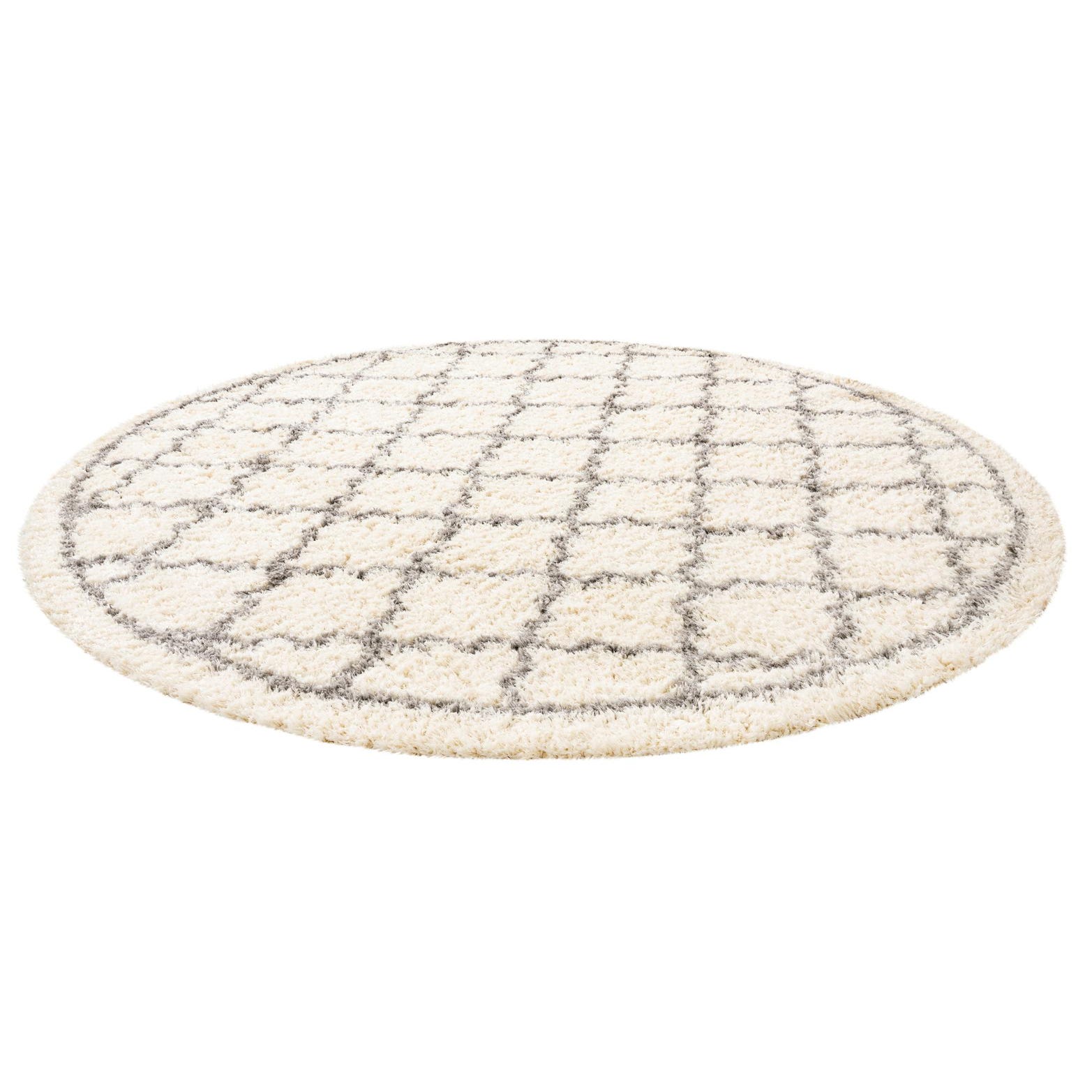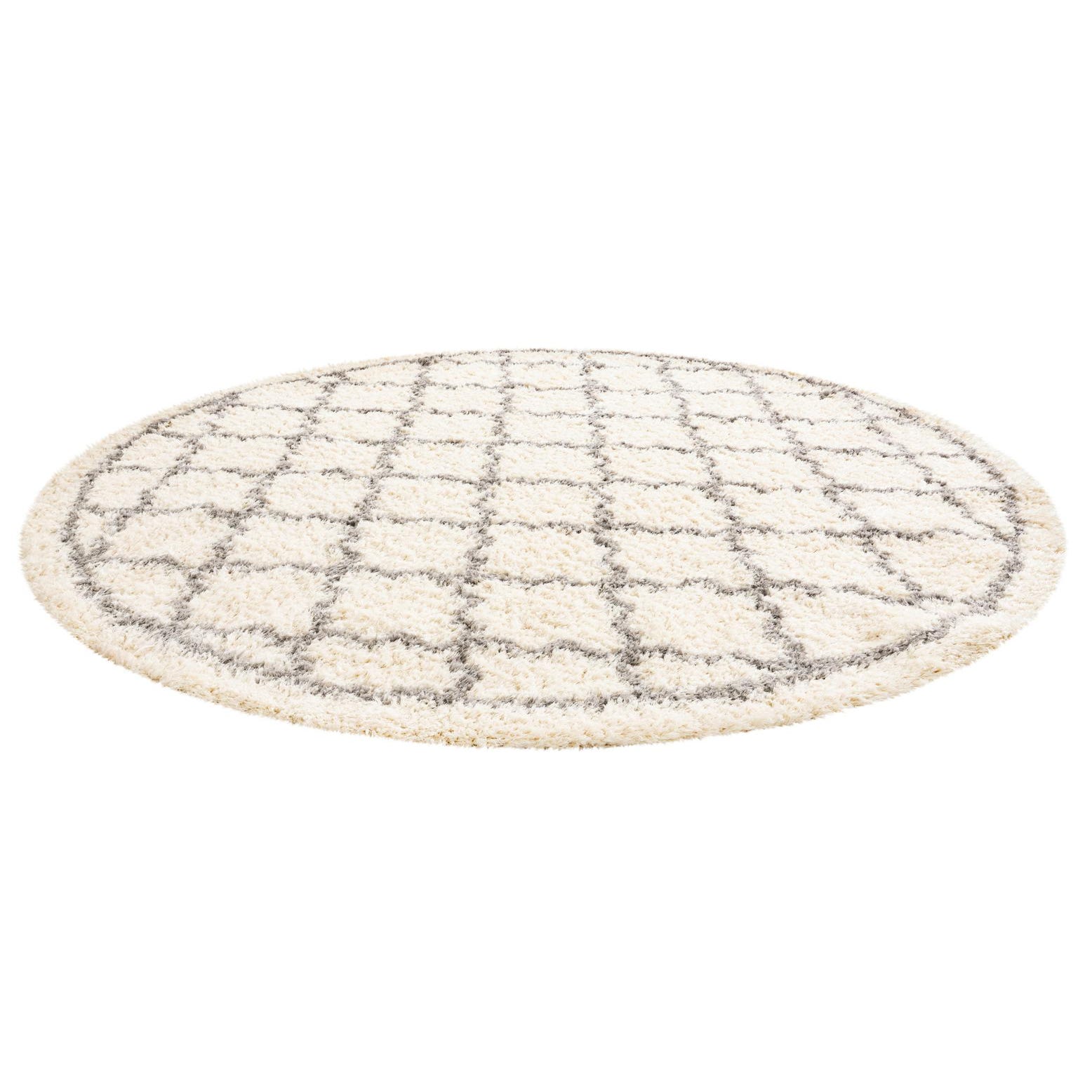 A round, cream-colored shag rug with a modern gray geometric trellis pattern, perfect for adding texture to a living room.