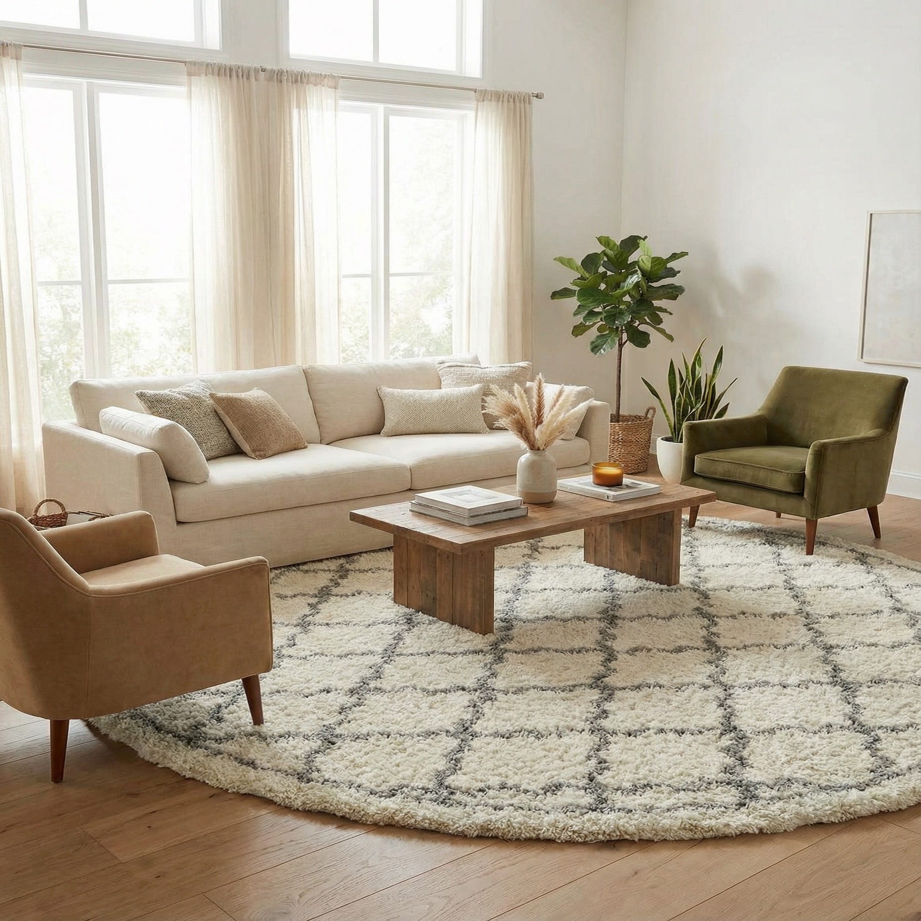 A round ivory shag rug with a modern gray trellis pattern, perfect for adding cozy texture to any indoor space.