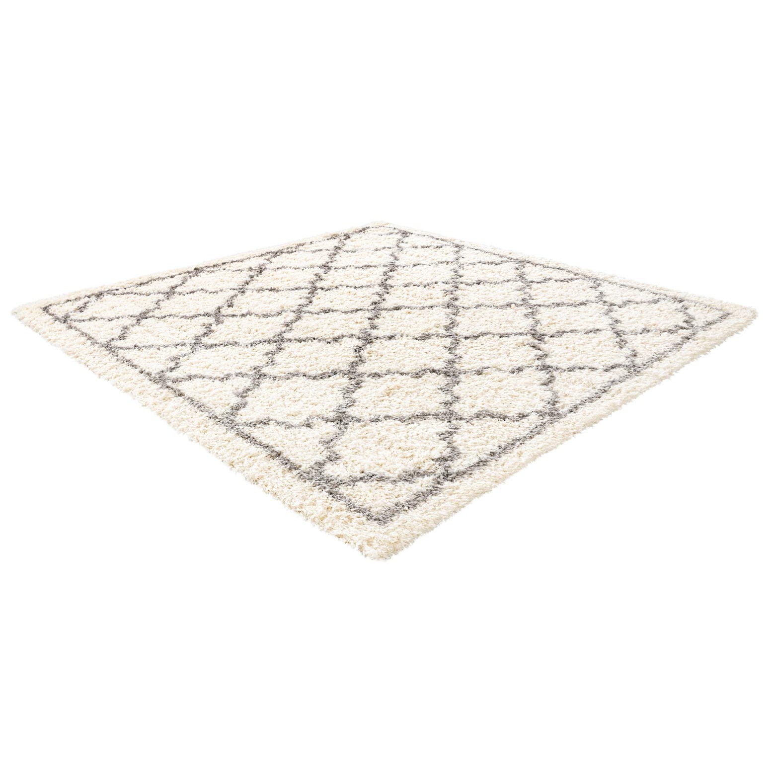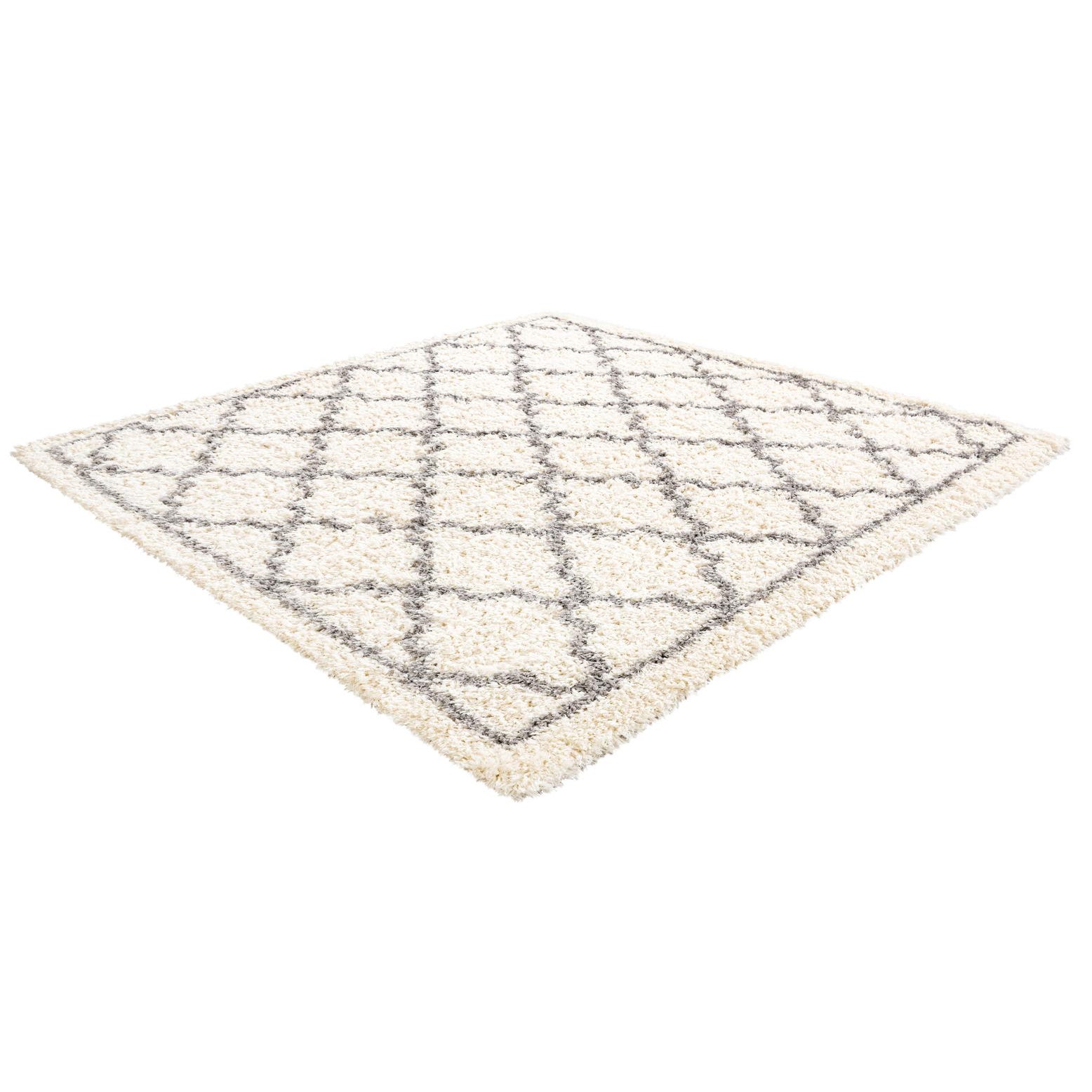 A soft, plush 8'x8' square ivory shag rug with a modern gray geometric trellis pattern, perfect for a living room or bedroom.