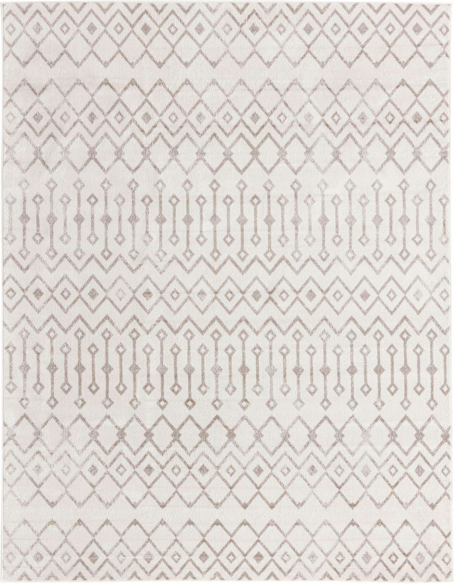 The Bohemian Trellis 8x10 area rug is a contemporary piece that draws on geometric inspiration to create an inviting atmosphere in any room. The rug's pattern features an array of interlocking trellis designs in a subtle gray on a pearl background, offering a modern yet timeless aesthetic.