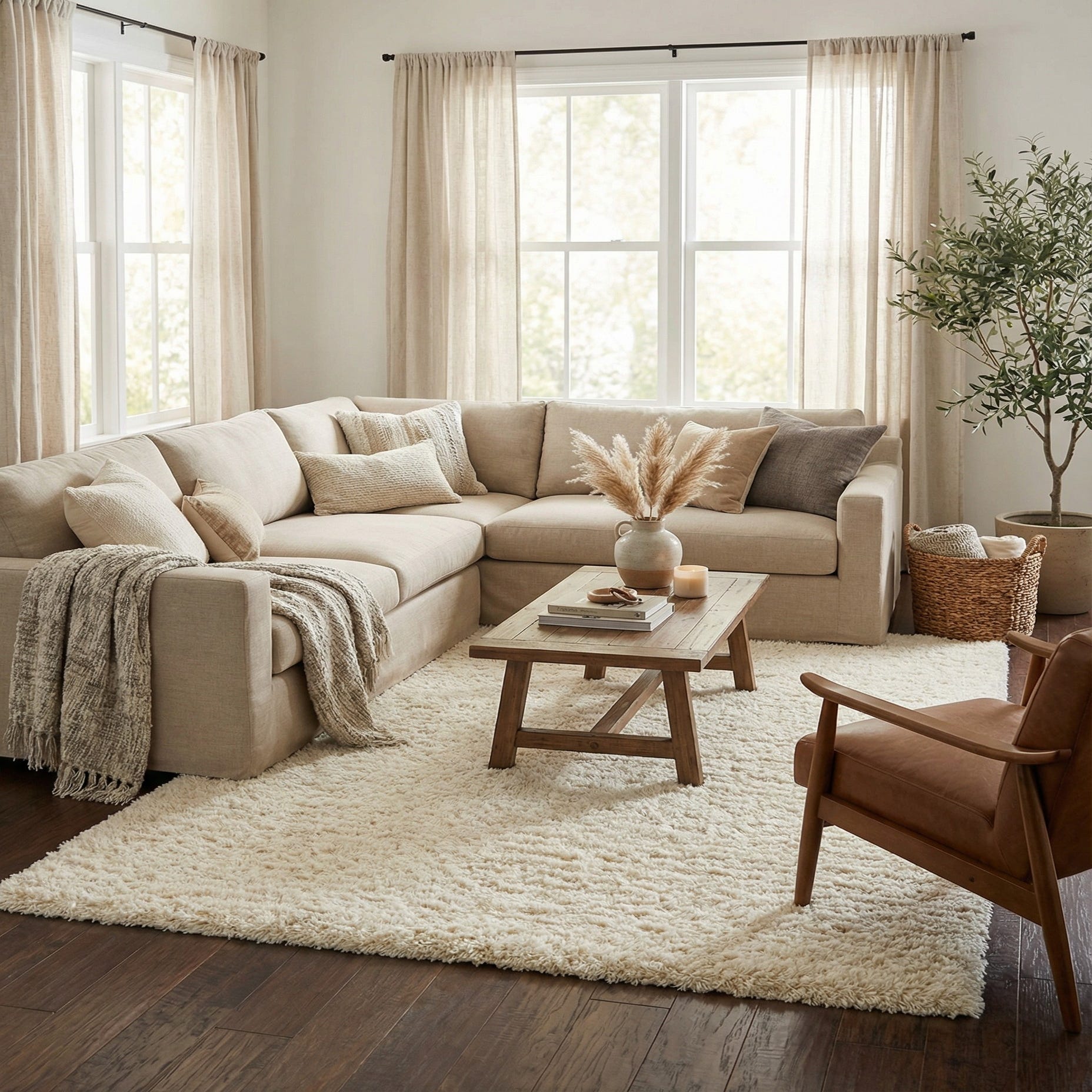 The neutral palette and uncomplicated texture fit a range of interiors, from modern and Scandinavian to transitional spaces seeking a softer edge. Use it to anchor a low-slung sofa in a living area, add layered warmth under a bed, or create a relaxed reading nook paired with light wood furniture, woven accents, and matte metal details. Its understated colorway coordinates well with soft pastels, natural materials, and minimalist decor.