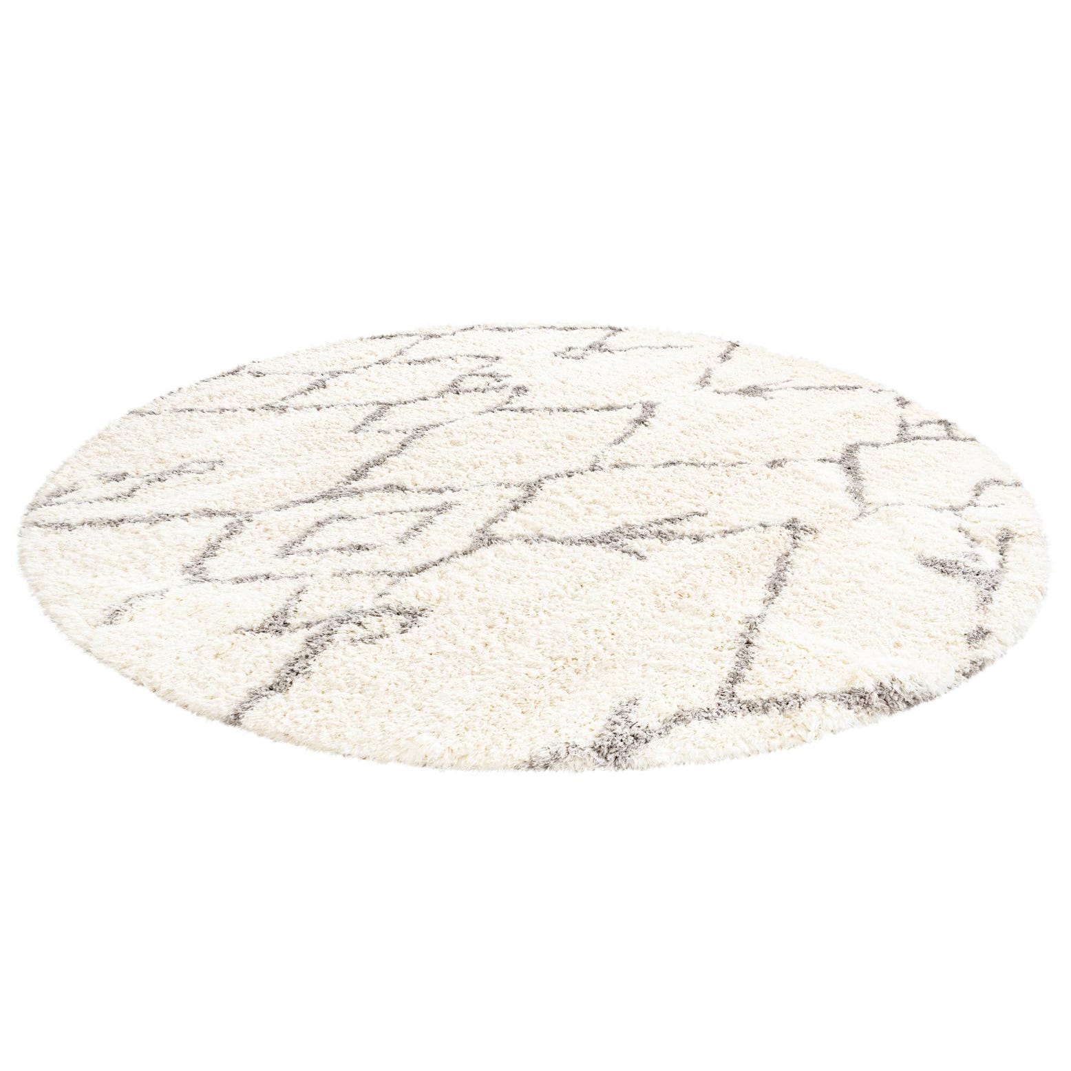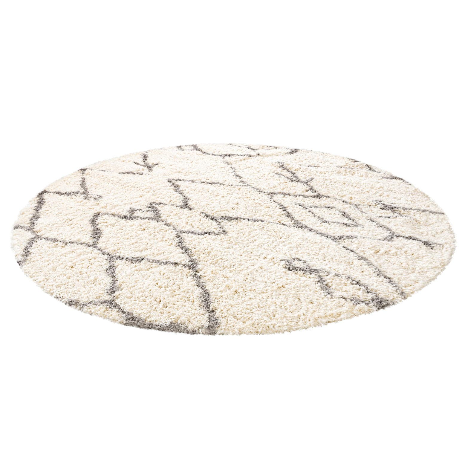 A 10-foot round shag rug with a modern gray geometric pattern on a creamy white background.