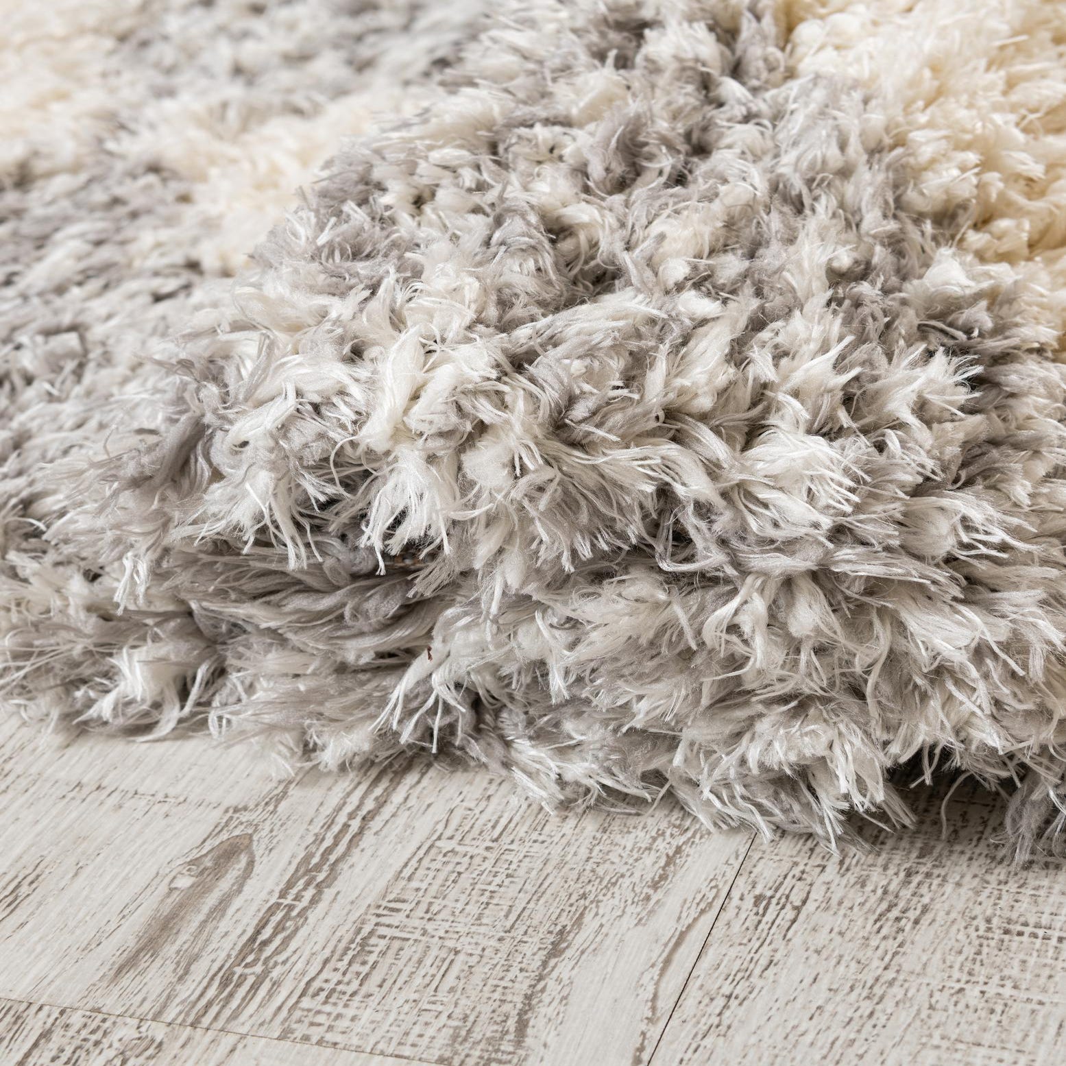 A 10-foot round shag rug in cream with a modern gray striped geometric pattern, perfect for a living room.